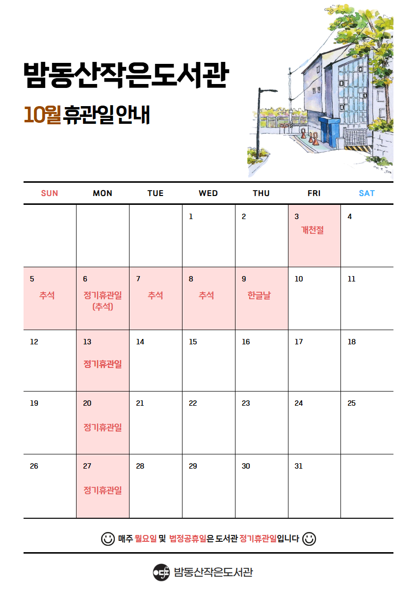 [밤동산작은도서관 2025년 10월 휴관일 안내]