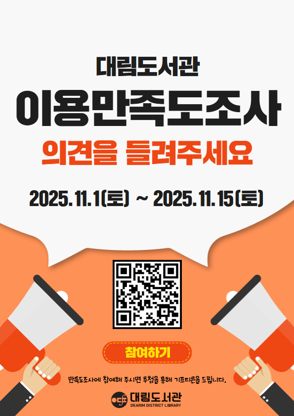 ![]() 🚩 2025년 대림도서관 이용만족도 조사 참여 안내 ✨참여기간: 25.11.1.(토)~11.15.(토) ✨참여대상: 누구나 ✨참여방법: 온/오프라인 (택 1) 1. 안내데스크 및 각 자료실에 비치된 설문조사지 작성 후 1층 안내데스크에 제출 2. 온라인 네이버 🚩 2025년 대림도서관 이용만족도 조사 참여 안내