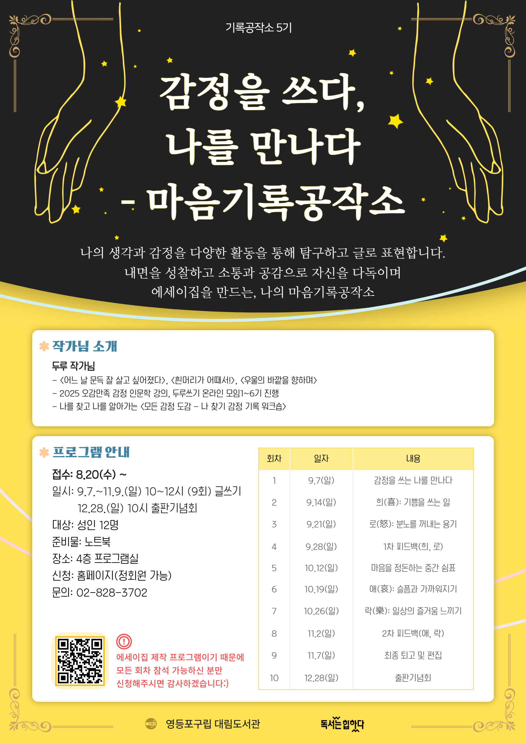 ![]() [기록공작소 5기] 감정을 쓰다, 나를 만나다 - 마음기록공작소 나의 생각과 감정을 다양한 활동을 통해 탐구하고 글로 표현합니다. 희, 로, 애, 락의 주제로 하나씩 감정을 짚어 내면을 성찰하고 소통과 공감으로 자신을 다독이며 에세이집을 만드는, 나의 마음기록공작소 ○ 접수: 8.20(수) ~ ○ 일시: 9.7.~11.9.(일) 10~12시 (9회) 글쓰기 12.28.(일) 10시 출판기념회 *9회차에 걸쳐 글을 쓰고 12월 출판기념회 파티에서 책을 공개합니다!:) ○ 대상: 성인 12명 ○ 준비물: 노트북 ○ 장소: 4층 프로그램실 ○ 신청: 대림도서관 홈페이지(정회원 가능) ○ 문의: 02-828-3702 *두루 작가님 - <어느 날 문득 잘 살고 싶어졌다>, <흰머리가 어때서!>, <우울의 바깥을 향하며> - 2025 오감만족 감정 인문학 강의, 두루쓰기 온라인 모임1~6기 진행 - 나를 찾고 나를 알아가는 <모든 감정 도감 - 나 찾기 감정 기록 워크숍> 감사합니다:) |