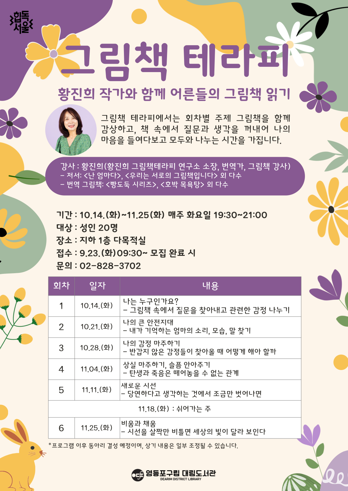 ![]() 황진희 작가와 함께 그림책 테라피: 어른들의 그림책 읽기 우리는 6주 간 매주 화요일 저녁에 만나 그림책 테라피스트이자 일본 그림책 번역가인 황진희 작가와 함께 도란도란 그림책을 감상하고, 책 속에서 질문과 생각을 꺼내어 우리의 마음을 들여다보고 모두와 나누는 시간을 가질 거예요. 6주 간 함께 하며 돈독해진 우리는 그림책과 함께 나누는 마음을 후속 동아리 결성으로 이어갈 거예요. 그림책에 관심 있는 누구나, 열린 마음으로 모두와 함께 그림책을 나누고 싶은 누구나, '그림책 테라피'의 문을 열어 주세요~ 모두들 환영합니다! ◎ 일시: 10.14.(화)~11.25.(화) 매주 화요일 19:30~21:00 / 총6회 ◎ 대상: 성인 20명 ◎ 장소: 지하 1층 다목적실 ◎ 접수: 9.23.(화) 9:30~ 모집완료 시 ◎ 신청: 도서관 홈페이지> 프로그램 신청(정회원 이상 신청 가능) ◎ 문의: 02-828-3702 ------------------------------------------------------- 대림도서관 프로그램 및 행사 신청 시 이용안내 도서관 행사 & 프로그램에 임박하여 취소하거나 당일불참, 잦은 결석 등을 방지하고자 노쇼 패널티 부여를 2024년 2월부터 시행하고 있습니다. 이용자들의 참여기회 확보와 도서관 자원을 효율적으로 사용하기 위함이오니 양해바랍니다. ◆ 신청 후 당일 취소 및 미통보 불참 ◆ 전체 강좌 일수의 50% 이상 결석 시(당일 취소 포함) 위의 사항에 해당하는 경우 대림도서관의 행사 및 프로그램 신청이 2개월 간 제한됩니다. (노쇼 패널티가 부여된 이용자에게는 패널티 시작일과 종료일을 알리는 문자가 발송 됩니다.) 1. 실제 참여자의 이름 및 아이디로 신청하고, 문자 발송되는 휴대전화 번호를 확인해주세요. (접수 시 휴대번호 오기입으로 안내 문자가 잘못 발송되는 경우가 있습니다.) 2. 프로그램 안내는 신청자 정보에 입력하신 휴대전화 번호로 문자 발송됩니다. 3. 프로그램 신청 취소 기간은 프로그램 유형마다 다릅니다. 4. 대기자는 결원 발생 시 대기자 순번에 따라 문자로 안내드립니다. 5. 참여 대상 및 신청 방법 등 자세한 내용은 프로그램 안내를 확인해 주십시오. 행사, 프로그램의 바른 예약 이행은 타인에 대한 배려의 시작입니다. 동참해주셔서 감사합니다. |