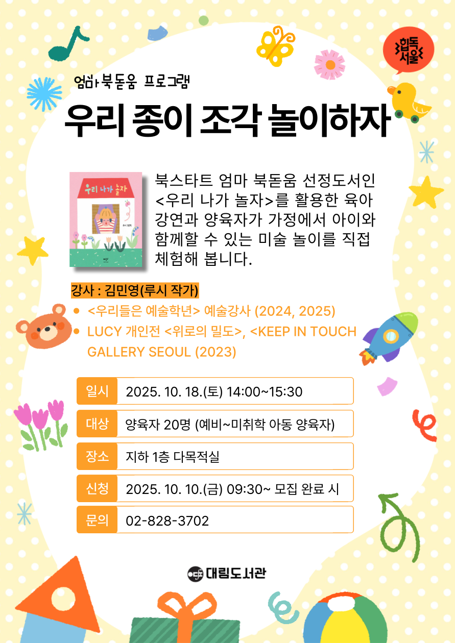 ![]() 엄마북돋움 프로그램 우리 종이 조각 놀이하자 북스타트 엄마 북돋움 선정도서인 <우리 나가 놀자>를 활용한 육아 강연과 양육자가 가정에서 아이와 함께할 수 있는 미술 놀이를 직접 체험해 봅니다. <프로그램 상세 내용> - 『우리 나가 놀자』 낭독과 작가가 육아하며 아이와 했던 미술 놀이 사례를 살펴봅니다. - 표현 기법인 색종이 콜라주를 체험합니다. - 아이의 그림을 보관하는 방법을 공유합니다. - 질의응답 ◎ 일시: 10.18.(토) 14:00~15:30 ◎ 대상: 성인 20명(예비~미취학 아동 양육자) ◎ 장소: 지하1층 다목적실 ◎ 접수: 10.10.(금) 09:30~ 모집완료 시 ◎ 신청: 도서관 홈페이지> 프로그램 신청(정회원 이상 신청 가능) ◎ 문의: 02-828-3702 ------------------------------------------------------- 대림도서관 프로그램 및 행사 신청 시 이용안내 도서관 행사 & 프로그램에 임박하여 취소하거나 당일불참, 잦은 결석 등을 방지하고자 노쇼 패널티 부여를 2024년 2월부터 시행하고 있습니다. 이용자들의 참여기회 확보와 도서관 자원을 효율적으로 사용하기 위함이오니 양해바랍니다. ◆ 신청 후 당일 취소 및 미통보 불참 ◆ 전체 강좌 일수의 50% 이상 결석 시(당일 취소 포함) 위의 사항에 해당하는 경우 대림도서관의 행사 및 프로그램 신청이 2개월 간 제한됩니다. (노쇼 패널티가 부여된 이용자에게는 패널티 시작일과 종료일을 알리는 문자가 발송 됩니다.) 1. 실제 참여자의 이름 및 아이디로 신청하고, 문자 발송되는 휴대전화 번호를 확인해주세요. (접수 시 휴대번호 오기입으로 안내 문자가 잘못 발송되는 경우가 있습니다.) 2. 프로그램 안내는 신청자 정보에 입력하신 휴대전화 번호로 문자 발송됩니다. 3. 프로그램 신청 취소 기간은 프로그램 유형마다 다릅니다. 4. 대기자는 결원 발생 시 대기자 순번에 따라 문자로 안내드립니다. 5. 참여 대상 및 신청 방법 등 자세한 내용은 프로그램 안내를 확인해 주십시오. 행사, 프로그램의 바른 예약 이행은 타인에 대한 배려의 시작입니다. 동참해주셔서 감사합니다. |