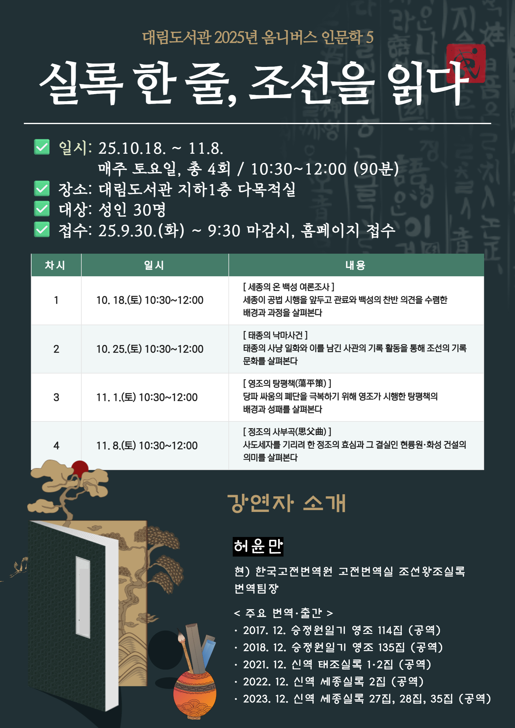 ![]() 옴니버스 인문학5 < 실록 한 줄, 조선을 읽다 > 조선왕조실록의 한 구절을 출발점으로 삼아, 그 속에 담긴 시대적 맥락과 군주의 삶을 인문학적으로 탐구하는 강연입니다 <프로그램 안내> ◎ 일시: 2025. 10. 18.~11. 8. / 매주 토요일, 총 4회 / 10:30~12:00 (90분) ◎ 대상: 성인 30명 ◎ 장소: 대림도서관 지하1층 다목적실 ◎ 접수: 25. 9. 30.(화) 9:30~ 마감 시 / 대림도서관 홈페이지 ◎ 문의: 02-828-3702 < 강연자 > 허윤만 현) 한국고전번역원 고전번역실 조선왕조실록번역팀장 · 2017. 12. 승정원일기 영조 114집 (공역) · 2018. 12. 승정원일기 영조 135집 (공역) · 2021. 12. 신역 태조실록 1·2집 (공역) · 2022. 12. 신역 세종실록 2집 (공역) · 2023. 12. 신역 세종실록 27집, 28집, 35집 (공역) -------------------------------------------------------- 대림도서관 프로그램 및 행사 신청 시 이용안내 도서관 행사 & 프로그램에 임박하여 취소하거나 당일불참, 잦은 결석 등을 방지하고자 노쇼 패널티 부여를 2024년 2월부터 시행하고 있습니다. 이용자들의 참여기회 확보와 도서관 자원을 효율적으로 사용하기 위함이오니 양해바랍니다. ◆ 신청 후 당일 취소 및 미통보 불참 ◆ 전체 강좌 일수의 50% 이상 결석 시(당일 취소 포함) 위의 사항에 해당하는 경우 대림도서관의 행사 및 프로그램 신청이 2개월 간 제한됩니다. (노쇼 패널티가 부여된 이용자에게는 패널티 시작일과 종료일을 알리는 문자가 발송 됩니다.) 1. 실제 참여자의 이름 및 아이디로 신청하고, 문자 발송되는 휴대전화 번호를 확인해주세요. (접수 시 휴대번호 오기입으로 안내 문자가 잘못 발송되는 경우가 있습니다.) 2. 프로그램 안내는 신청자 정보에 입력하신 휴대전화 번호로 문자 발송됩니다. 3. 프로그램 신청 취소 기간은 프로그램 유형마다 다릅니다. 4. 대기자는 결원 발생 시 대기자 순번에 따라 문자로 안내드립니다. 5. 참여 대상 및 신청 방법 등 자세한 내용은 프로그램 안내를 확인해 주십시오. 행사, 프로그램의 바른 예약 이행은 타인에 대한 배려의 시작입니다. 동참해주셔서 감사합니다. |