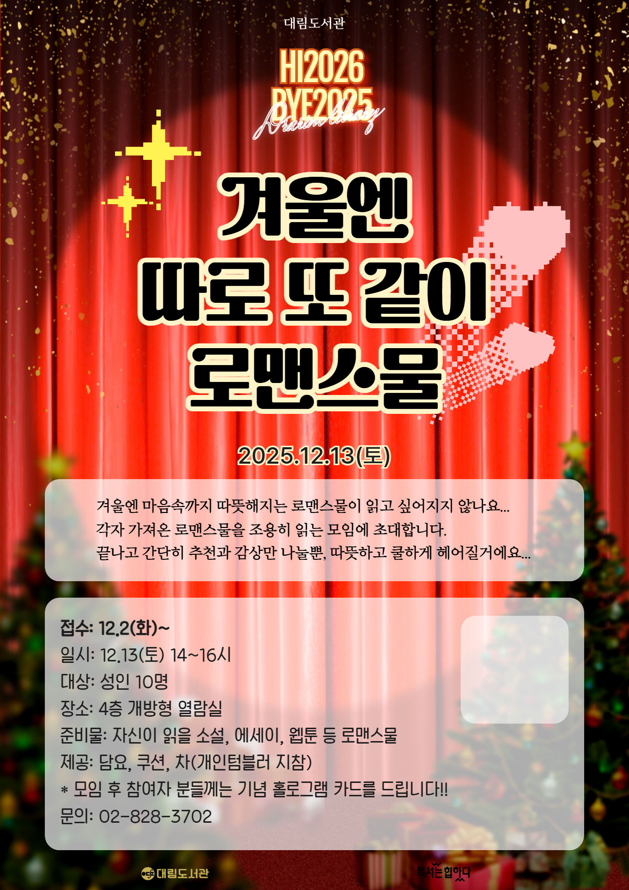 ![]() [HI2026BYE2025] 따로 또 같이 로맨스물 겨울엔 마음속까지 따뜻해지는 로맨스물이 읽고 싶어지지 않나요... 각자 가져온 로맨스물을 조용히 읽는 모임에 초대합니다. 끝나고 간단히 추천과 감상만 나눌뿐, 따뜻하고 쿨하게 헤어질거에요... 접수: 11.29(토)~ 일시: 12.13(토) 14~16시 대상: 성인 10명 장소: 4층 개방형 열람실 준비물: 자신이 읽을 소설, 에세이, 웹툰 등 로맨스물 제공: 담요, 쿠션, 차(개인텀블러 지참) * 모임 후 참여자 분들께는 기념 홀로그램 카드를 드립니다!! 문의: 02-828-3702 |