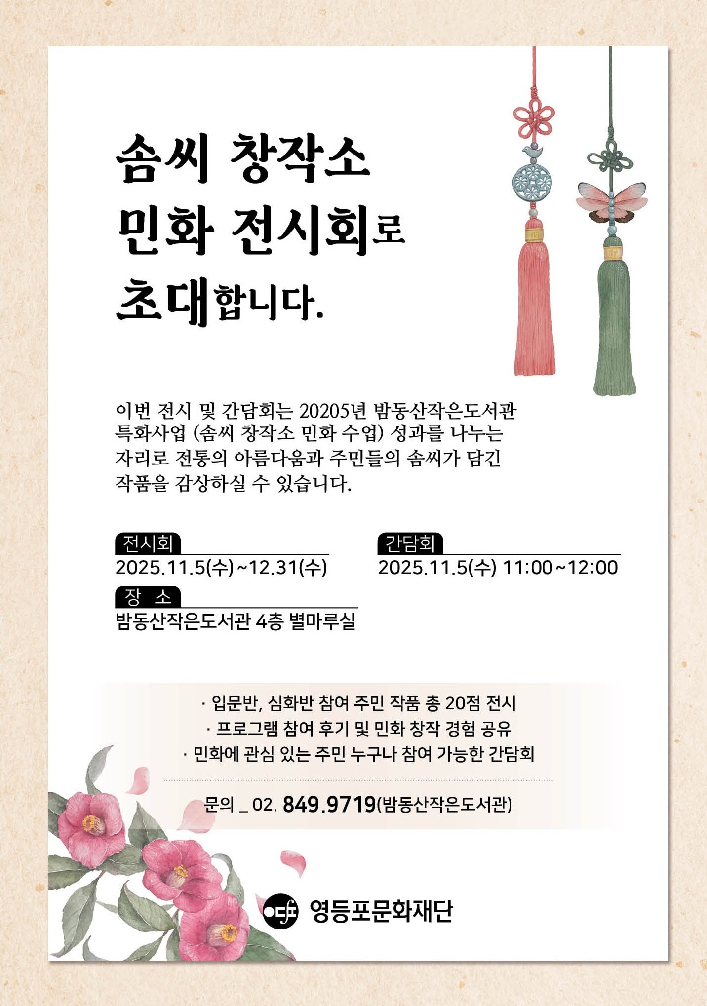 ![]() 밤동산작은도서관 <솜씨 창작소 민화 전시회> 안내 전시회 ◎ 일시: 2025. 11. 5.(수)~ 12.31.(수) ◎ 장소: 밤동산작은도서관 4층 별마루 간담회 ◎ 일시: 2025. 11. 5.(수) 11:00~12:00 ◎ 장소: 밤동산작은도서관 4층 별마루 2025년 민화 입문반, 심화반 참여 주민 작품 총 20점을 전시합니다. 많은 관심 부탁드립니다! 문의: 02-849-9717 (밤동산작은도서관) |