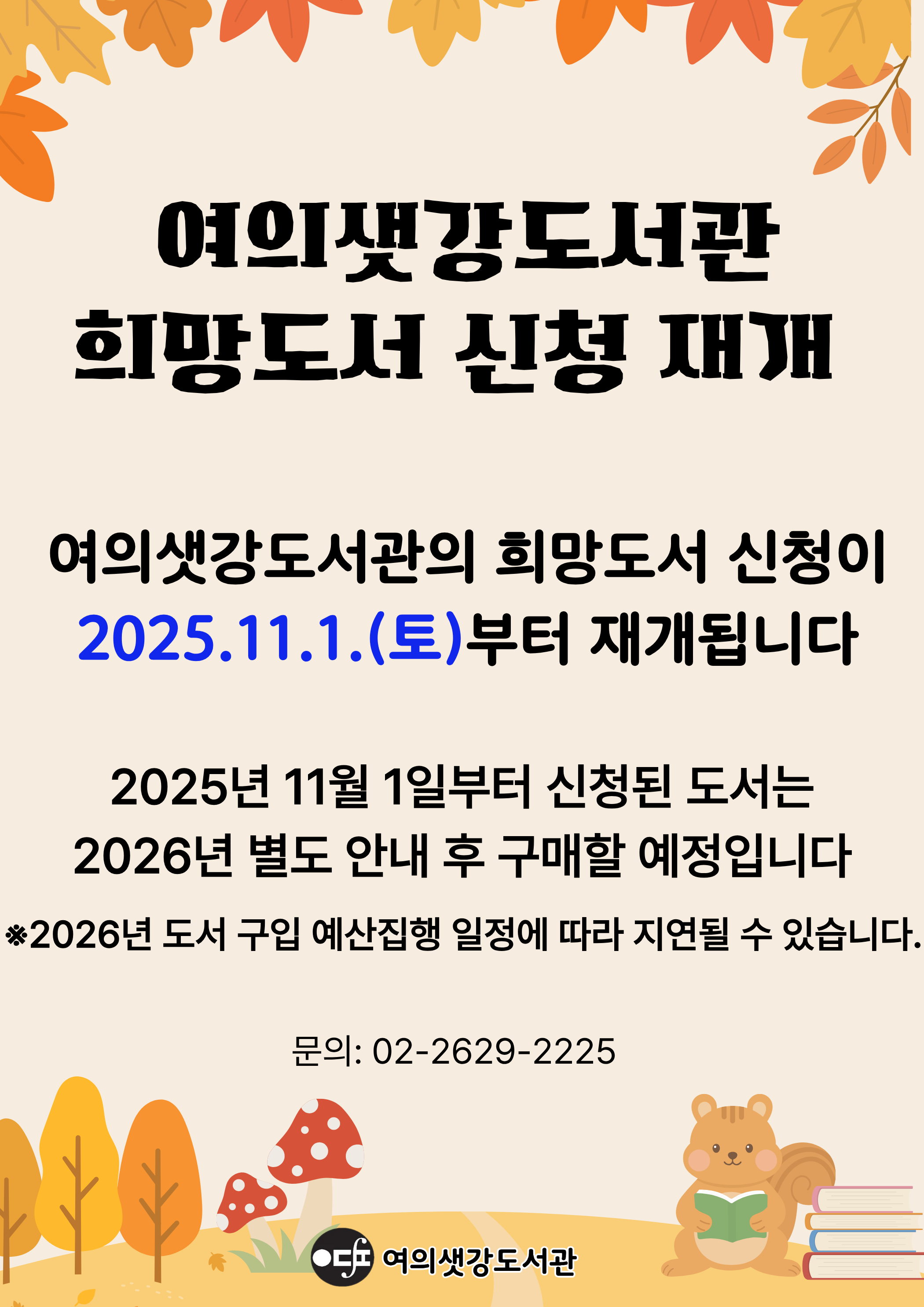 여의샛강도서관의 희망도서 신청이 2025년 11월 1일(토)부터 재개됩니다.