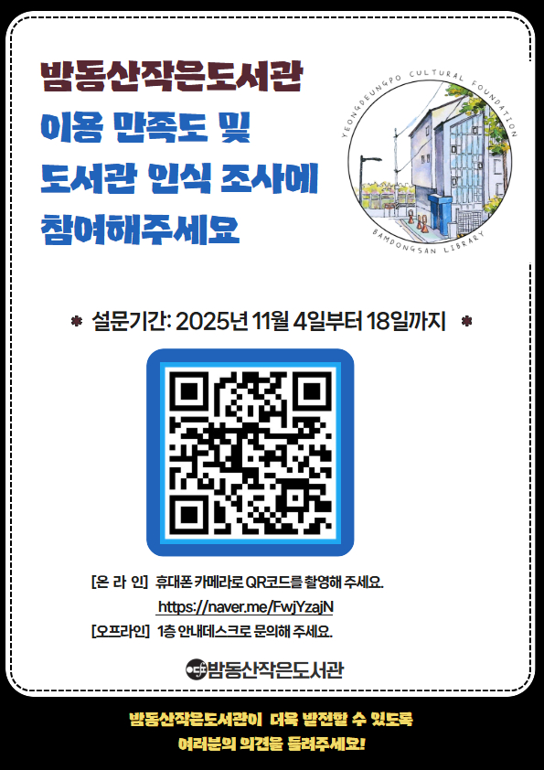 ►참여기간 : 2025. 11. 04.(화)~11. 18.(화) ►참여대상: 누구나 ►참여방법: 오프라인 (1층 안내데스크에 비치된 설문지 작성) 온라인 (QR코드 or 설문 안내 링크 클릭) ►설문조사바로가기: https://naver.me/FwjYzajN 많은 관심과 참여 부탁드립니다!! 문의: 02)849-9716 |