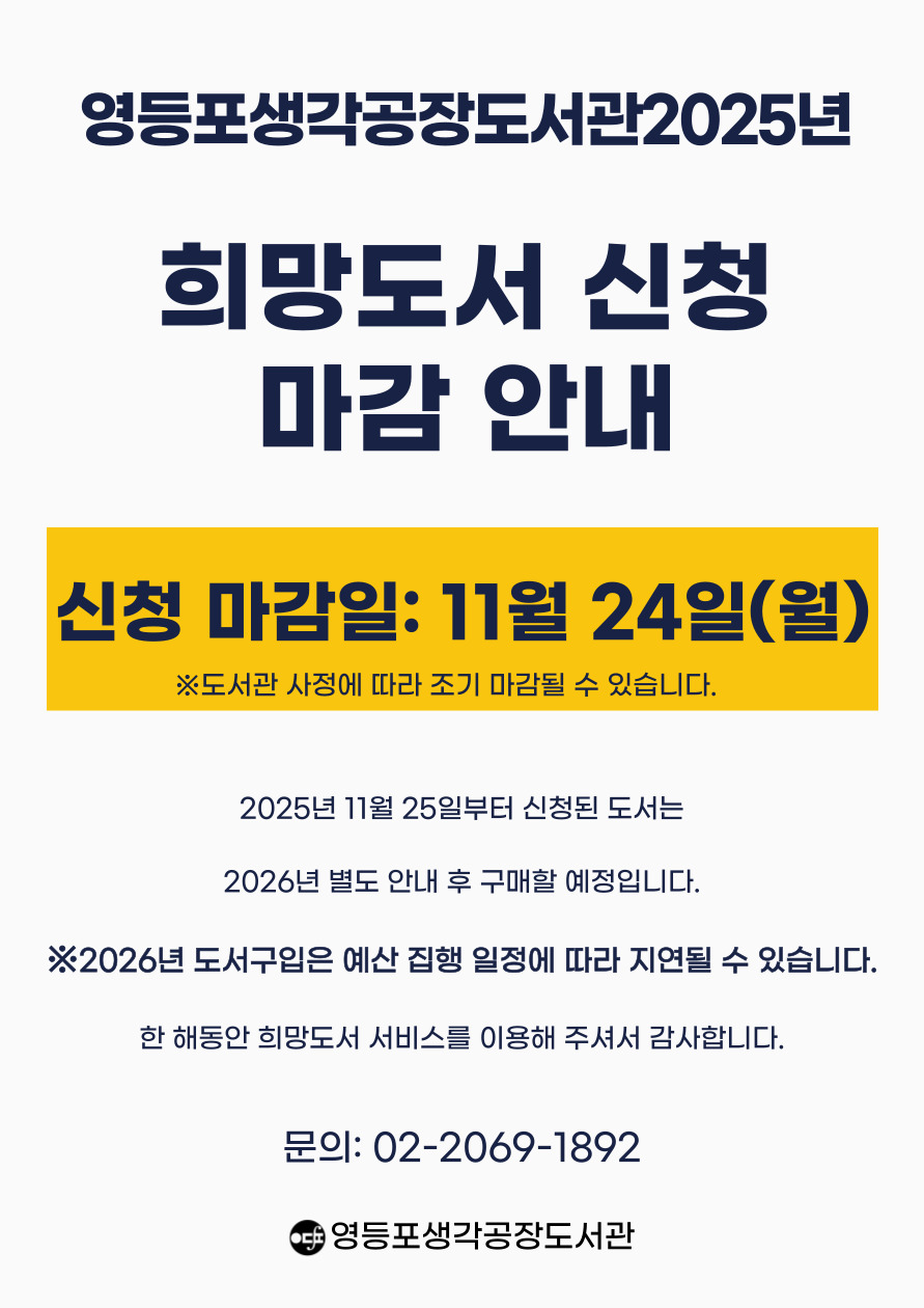 2025년도 영등포생각공장도서관 희망도서 신청 마감일 안내드립니다. 11월 24일 이후부터 신청되는 도서는 2026년 별도 안내 후 구매할 예정입니다. 2026년 도서 구입은 예산집행 일정에 따라 지연될 수 있습니다. 한 해동안 희망도서 서비스를 이용해 주셔서 감사합니다. ✅신청기한: 2025.11.24(월)까지 ☎️문의:02-2069-1893 ![]() |