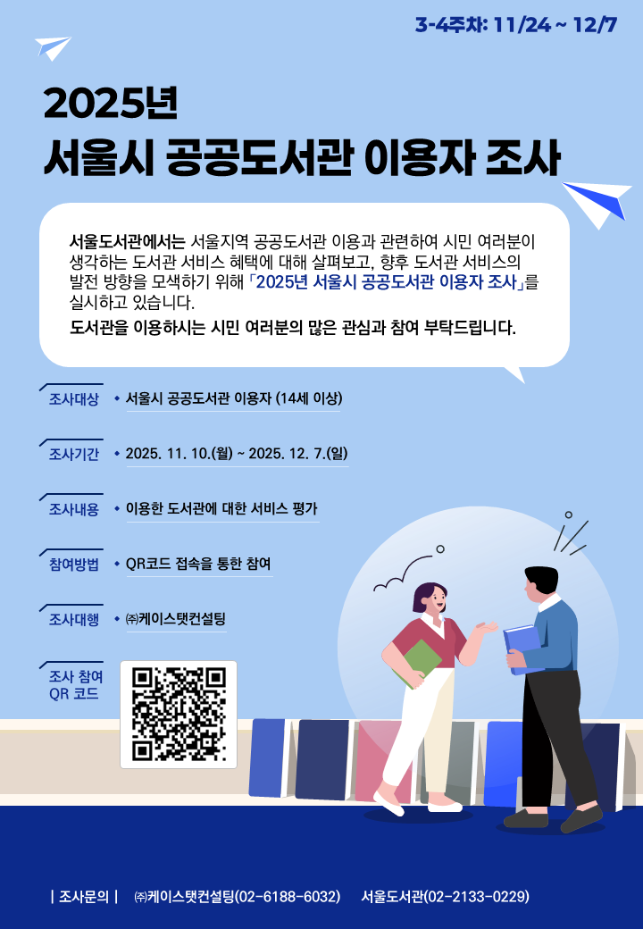 | 제목 | [공지] 2025년 서울시 공공도서관 서비스 성과조사(~12.14, 기간 연장) |