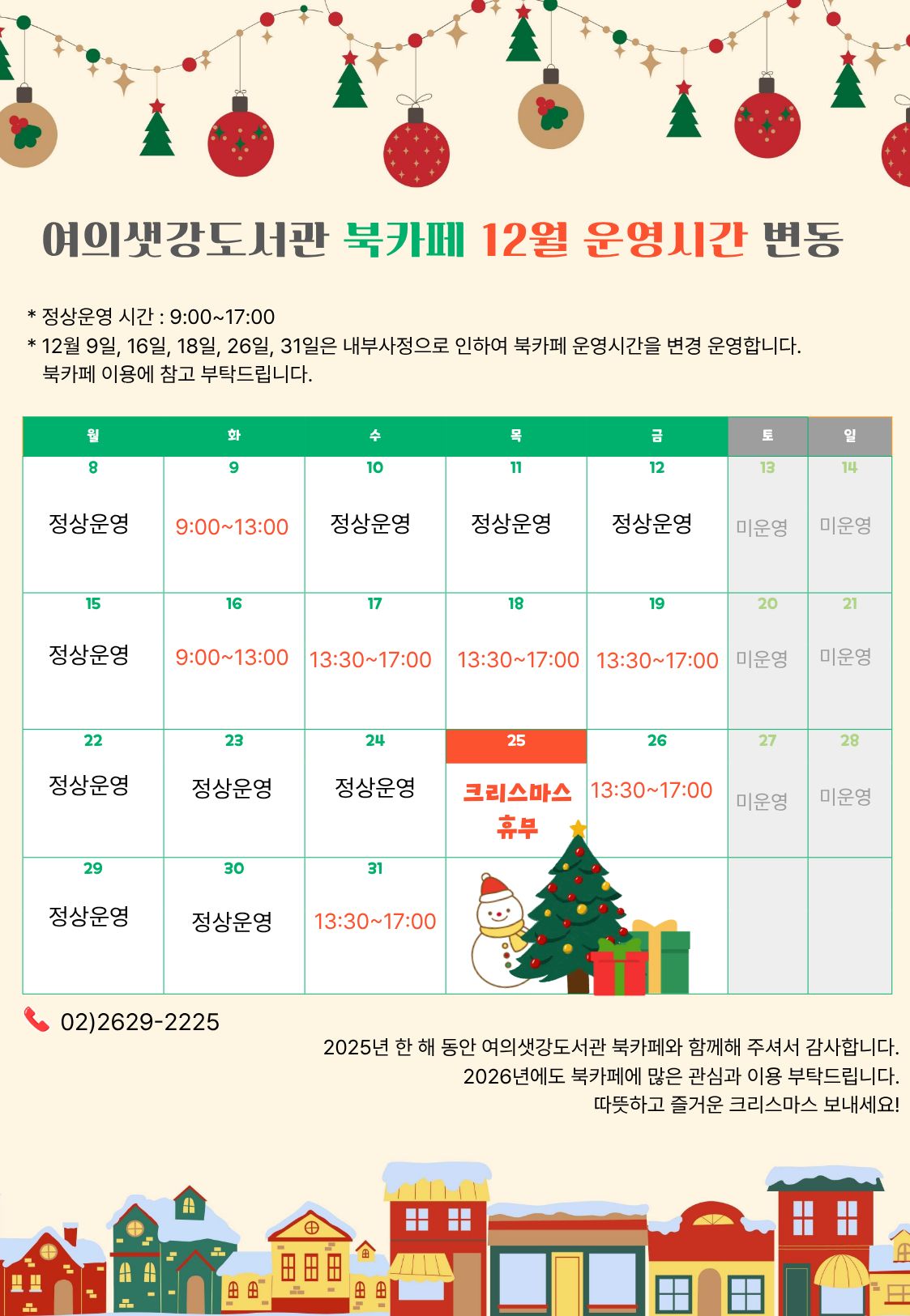 ![]() <여의샛강도서관 북카페 12월 운영시간 변동> *정상운영 시간: 9:00~17:00 *12월 9일, 16일 17일, 18일, 19일, 26일, 31일은 내부사정으로 인하여 북카페 운영시간을 변경 운영합니다. 북카페 이용에 참고 부탁드립니다. 12월 9일(화) 9:00~13:00 12월 16일(화) 9:00~13:00 12월 17일(수) 13:30~17:00 12월 18일(목) 13:30~17:00 12월 19일(금) 미운영 12월 25일(목) 크리스마스 휴무 12월 26일(금) 13:30~17:00 12월 31일(수) 13:30~17:00 문의: 02-2629-2225 2025년 동안 여의샛강도서관 북카페와 함께해 주셔서 감사합니다. 2026년에도 북카페에 많은 관심과 이용 부탁드립니다. 따뜻하고 즐거운 크리스마스 보내세요! |