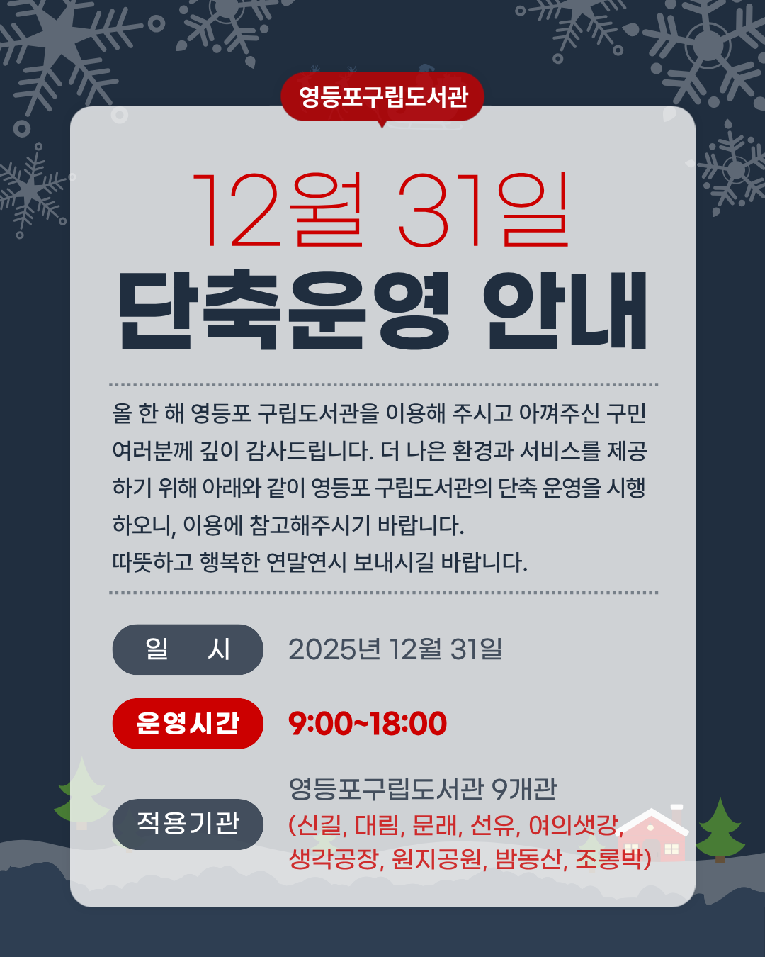 영등포구립도서관 12월 31일 단축운영 안내 올 한 해 영등포 구립도서관을 이용해 주시고 아껴주신 구민 여러분께 깊이 감사드립니다. 더 나은 환경과 서비스를 제공하기 위해 아래와 같이 영등포 구립도서관의 단축 운영을 시행하오니 이용에 참고해주시기 바랍니다. 따뜻하고 행복한 연말연시 보내시길 바랍니다. 일시: 2025년 12월 31일 운영시간: 9:00~18:00 적용기관: 영등포구립도서관 9개관(신길, 대림, 문래, 선유, 여의샛강, 생각공장, 원지공원, 밤동산, 조롱박) 사유: 2026년 대비 전산장비 점검 세팅 및 도서관 내 환경 정비 |