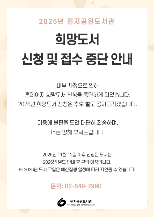 | 제목 | 원지공원도서관 2025년도 희망도서 신청 중단 안내 |