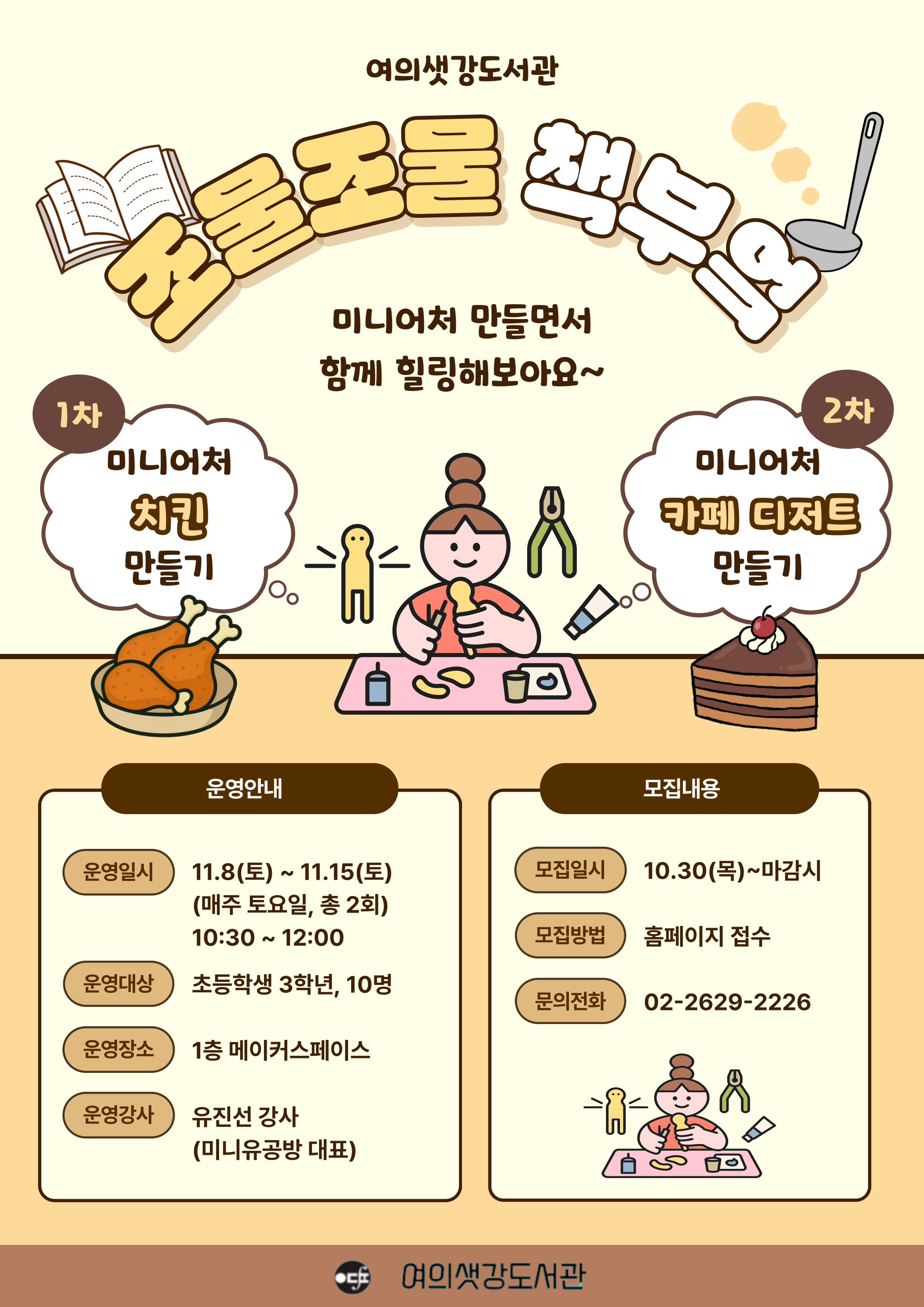 |  <조물조물 책부엌> - 일시 : 2025.11.8~11.15(매주 토, 총2회), 10:30~12:00 - 대상: 초등3학년, 10명 - 강사: 유진선 강사 - 장소: 여의샛강도서관 1층 메이커스페이스 - 접수: 2025.10.30(목) ~ 마감시 - 방법: 홈페이지 접수 - 문의: 02-2629-2226 ** 유의사항 - 영등포구립도서관 정회원만 신청 가능합니다.  | |