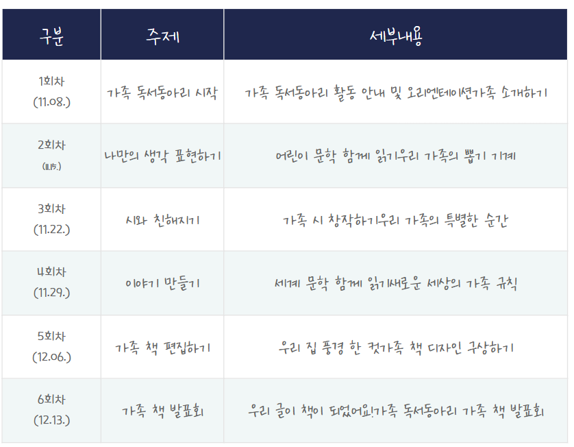 |  2025 책톡톡 프로젝트 :가족 리딩크루 책톡톡 프로젝트: 가족 리딩크루는 가족들이 리딩크루가 되어 함께 책을 읽고 느낀점을 다양하게 표현해보는 "6주간의 가족 독서 프로그램"입니다. 최소 인원의 크루와 진행하기 때문에, 전 회차에 참석 가능한 가족을 대상으로 모집 진행합니다. 가족과 함께 책을 읽고 나누며 색다른 소통을 함께 나누어요 :-)