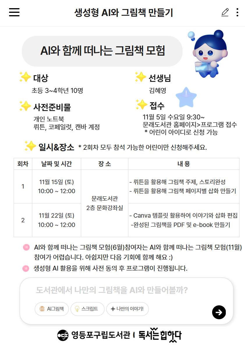 | 강좌명 | 【어린이】 AI와 함께 떠나는 그림책 모험 |