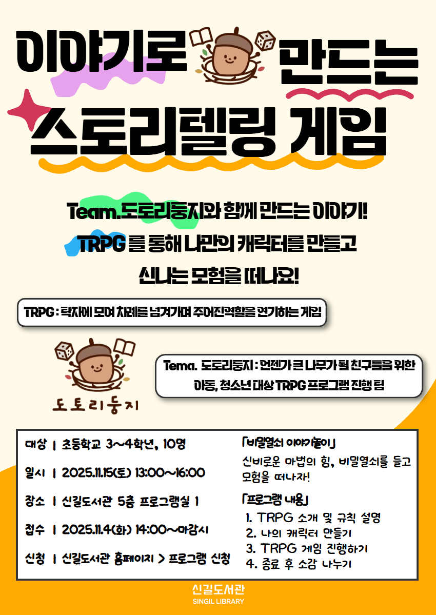 ![]() 🎲이야기로 만드는 스토리텔링 게임💬 우리가 직접 만드는 이야기! TRPG를 통해 나만의 캐릭터를 만들고 신나는 모험을 떠나보자! 팀 도토리둥지가 언젠가 큰 나무가 될 친구들을 위한 아동, 청소년 TRPG 프로그램을 진행합니다. 『TRPG?, TRPG는(Tabletalk Role Playing Game): 탁자에 모여 차례를 넘겨가며 주어진 역학을 연기해나가는 게임입니다. Team. 도토리둥지? 언젠가 큰 나무가 될 친구들을 위한 아동, 청소년 대상 TRPG 프로그램 진행 팀입니다.』 TRPG 프로그램은 『비밀열쇠 이야기놀이』입니다. ![]() "신비로운 마법의 힘, 비밀열쇠를 들고 모험을 떠나자!" 참여자는 '보이지 않는 나라'에서 온 동물 마법사 퍼밀리어, 공룡 기사, 꽃밭의 지킴이 꿀벌, 드론 과학자 중 하나가 됩니다. '보이지 않는 나라'에는 수많으 고민과 어려움, 그리고 모험과 새로운 발견이 존재합니다. 과연 모험을 떠난 여러분에게 어떤 일이 일어나게 될까요?? ▪️ 프로그램 일시: 11월 15일 토요일 13:00~16:00 ▪️ 장소: 신길도서관 5층 프로그램실 1 ▪️ 대상: 초등학교 3학년~4학년, 10명 ▪️ 모집일시: 11월 4일(화) 오후 2시부터 ~마감시 ▪️ 신청방법: 신길도서관 홈페이지 로그인 후 프로그램 신청 (정회원만 신청 가능) ✔️ 프로그램 중 촬영된 사진은 비영리 목적의 도서관 홍보에 사용될 수 있으며, 프로그램 신청 시 이에 동의한 것으로 간주됩니다. 📞문의: 02-2165-7700 |