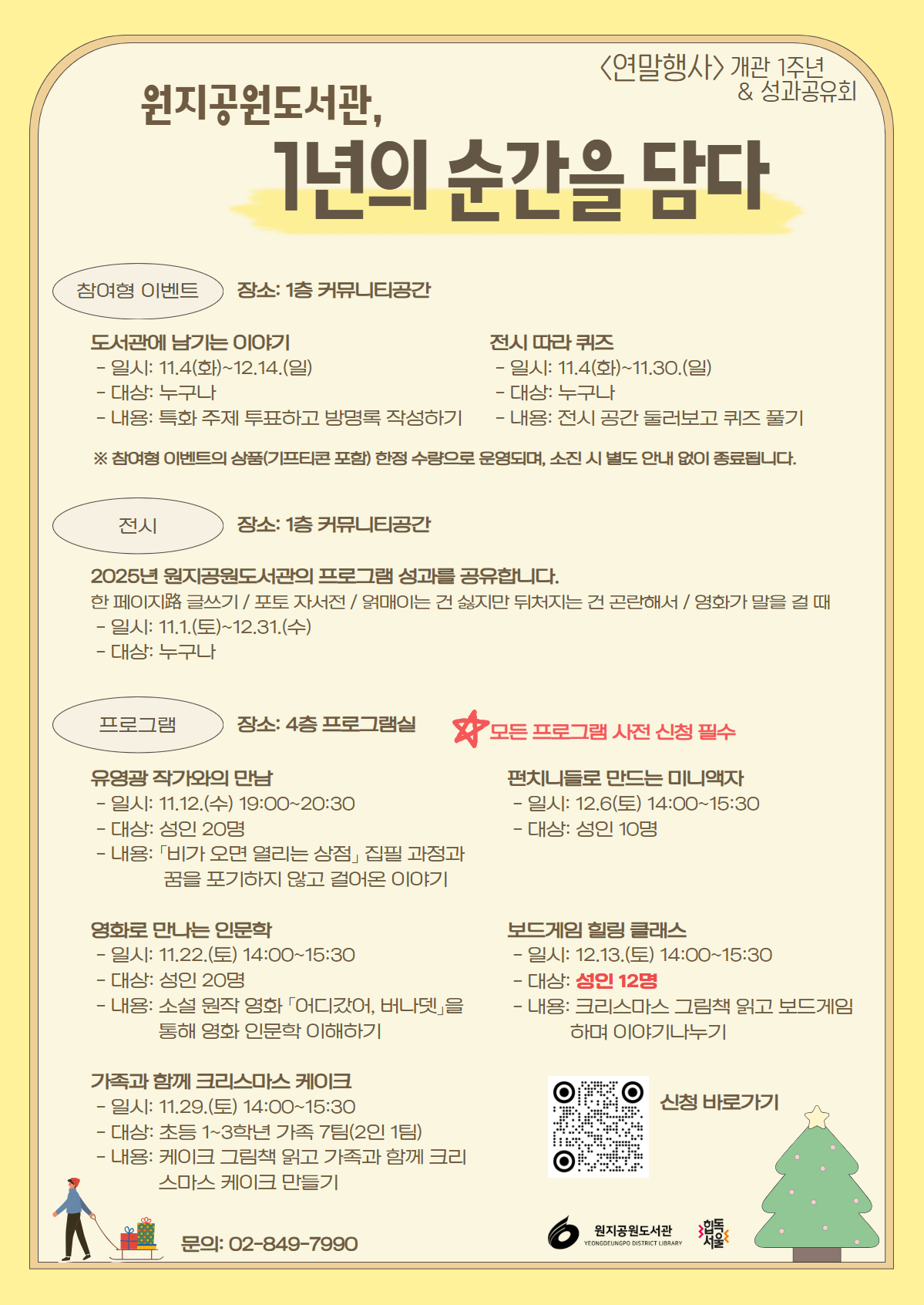 📌회원증을 발급받은 정회원만 신청 가능합니다. (준회원: 영등포구립도서관 회원증 미발급자로 홈페이지 회원가입만 되어있는 상태) 📌SMS 수신 동의 여부와 무관하게 안내 문자 및 담당자 연락을 받으실 수 있습니다. 📌 프로그램 중 촬영된 사진은 비영리 목적의 도서관 홍보에 사용될 수 있으며, 프로그램 신청 시 이에 동의한 것으로 간주됩니다. ![]() [연말 행사] 보드게임 힐링 클래스 - 일시: 12.13.(토) 14:00~15:30 - 대상: 성인 12명 - 내용: 크리스마스 그림책 읽고 보드게임하며 이야기 나누기 ※아래 신중년 대상 프로그램과 동일합니다. |