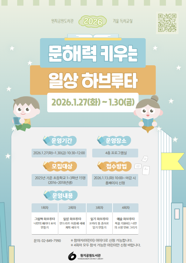 📌회원증을 발급받은 정회원만 신청 가능합니다. (준회원: 영등포구립도서관 회원증 미발급자로 홈페이지 회원가입만 되어있는 상태) 📌SMS 수신 동의 여부와 무관하게 안내 문자 및 담당자 연락을 받으실 수 있습니다. 📌 프로그램 중 촬영된 사진은 비영리 목적의 도서관 홍보에 사용될 수 있으며, 프로그램 신청 시 이에 동의한 것으로 간주됩니다. ![]() 추운 겨울, 따뜻한 도서관에서 책으로 놀며 문해력을 키워볼까요? 원지공원도서관 2026 겨울 독서교실 「문해력 키우는 일상 하브루타」 참가자를 모집합니다! 1. 운영기간: 2026. 1. 27.(화) ~ 1. 30.(금) / 10:30~12:00 (총 4회) 2. 운영장소: 원지공원도서관 4층 프로그램실 3. 모집대상 / 인원: 2025년 기준 초등학교 1~3학년 15명 (2016~2018년생) 4. 접수방법: 2026. 1. 13.(화) 10:00 ~ 마감 시 / 홈페이지 신청 5. 운영내용 - 1회차: 그림책 하브루타 – 나만의 패러디 표지 만들기 - 2회차: 일상 하브루타 – 만드라트를 통한 새해 계획 세우기 - 3회차: 일기 하브루타 – 코끼리 똥 종이로 수첩 만들기 - 4회차: 예술 하브루타 – 복을 기원하는 나만의 소망 민화 그리기 * 참여자(어린이)의 정회원 아이디로만 신청 가능합니다. * 4회차 모두 참석 가능한 어린이만 신청 바랍니다. 6. 문의: 02-849-7990 |