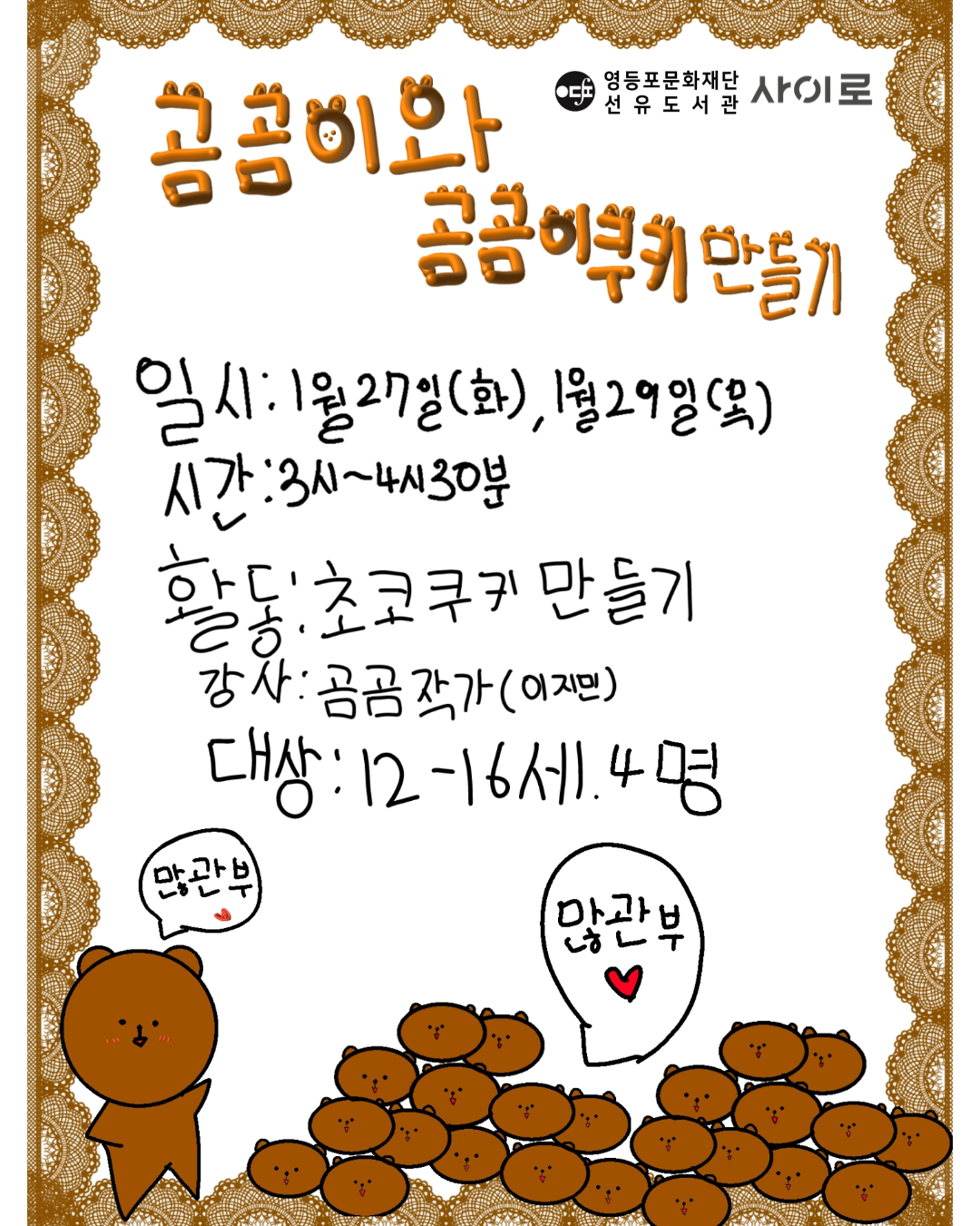 [선유도서관 사이로 또래작가 워크숍] 일시 : 2026.1.29.(목) 15:00~16:30 장소 : 사이로 베이킹존(3층) 진행: 이지민(곰곰작가) 14세 또래작가 곰곰이와 함께하는 쿠키만들기! 곰곰작가님의 캐릭터인 곰곰이쿠키를 그려 완성해볼까요? ** 선유도서관 사이로 트윈세대 작가(곰곰)가 직접 운영하는 프로그램으로, 추가 수강은 불가합니다.(최대 정원 4명) ** 사이로 이용이 처음인 경우, 공간라운딩을 위해 20분 먼저 방문해주세요. ** 영등포구립도서관 가입이 안되어있을 경우, 신청이 불가합니다. (홈페이지 가입 후 정회원 승급까지 완료해야함 (승급은 방문이 원칙이나, 프로그램으로 인한 승급은 전화요청 가능합니다) ![]() |