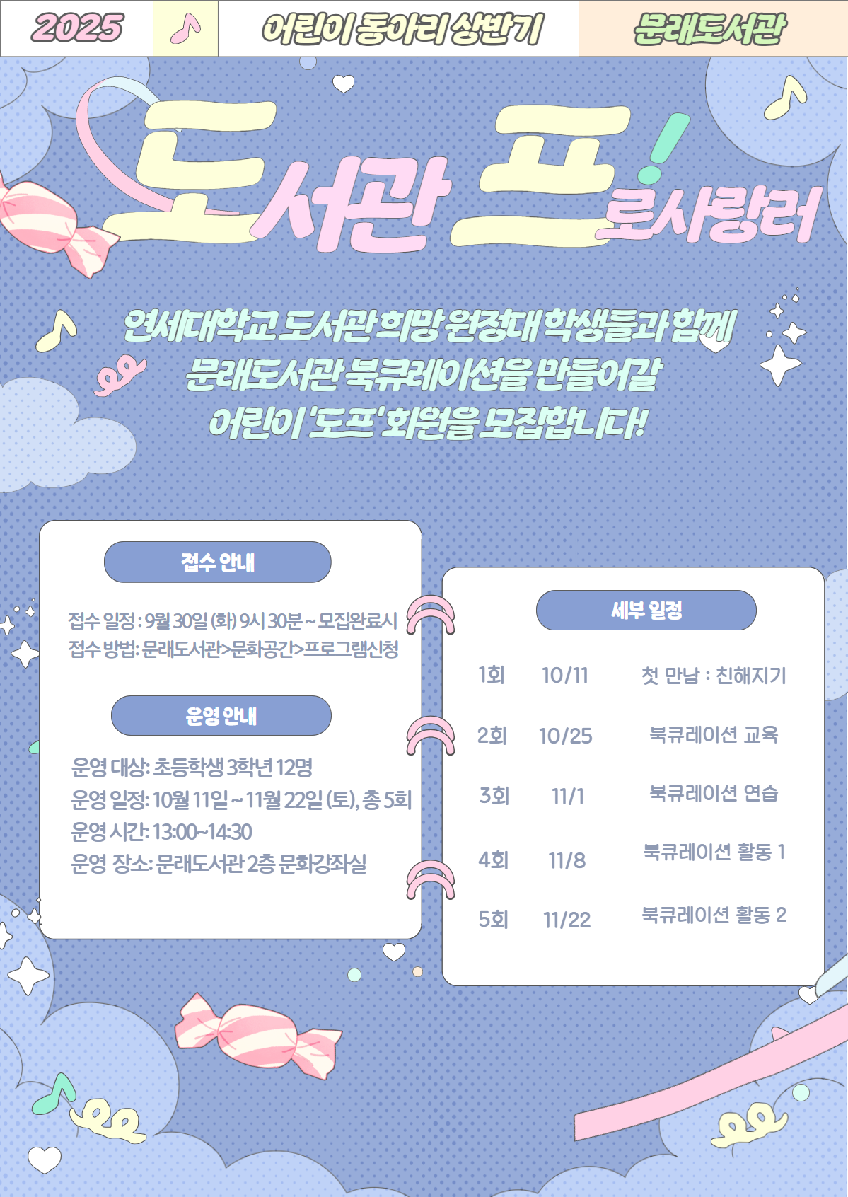 ![]() <어린이 동아리: 도프(도서관 프로사랑러) 모집 > 연세대학교 도서관 희망 활동 원정대 봉사단 학생들과 함께 문래도서관 북큐레이션을 만들어갈 어린이 동아리원 '도프'들을 모집합니다. 대상: 초등학교 3-4학년 어린이 12명 시간: 2025년 10월11일(토) ~ 11월22일(토) 13시 - 14시 30분 (회차별 날짜 확인 부탁드립니다.) 1회차 : 10월 11일 (토) 첫 만남: 친해지기 2회차 : 10월 25일 (토) 북큐레이션 교육 3회차 : 11월 1일(토) 북큐레이션 연습 4회차 : 11월 8일(토) 북큐레이션 활동 1 5회차 : 11월 22일(토) 북큐레이션 활동2 * 12월 북큐레이션 전시를 목표로 진행하는 어린이 동아리 입니다. 1~5회차 모두 참여 가능한 분만 접수해주세요. * 대학생 자원봉사단과 어린이들이 함께 토론하고 탐구하며 만들어 가는 참여형 동아리 입니다. (수업식 프로그램이 아닙니다.) 아래는 2기 활동 내용입니다. ![]() ![]() ![]() |