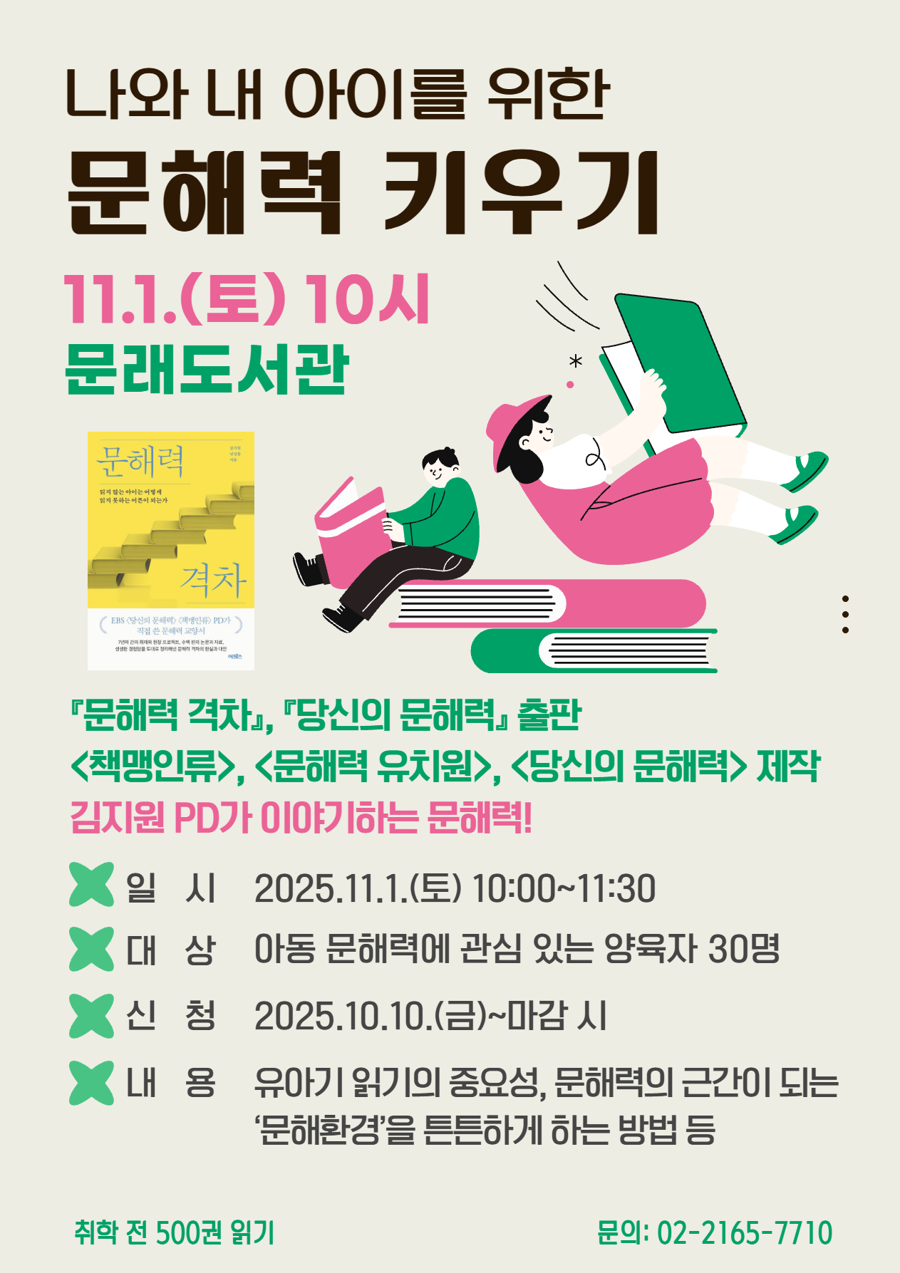![]() 아이 때의 읽기가 평생의 문해력을 결정합니다. 우리아이 문해력에 관심 있는 누구나! <책맹인류>, <문해력 유치원>을 제작하고 「문해력 격차」를 발간한 김지원PD의 강연을 함께 들어보세요:) 📚일 시: 11월 1일(토) 오전10시~11시30분 📚대 상: 유아 문해력에 관심 있는 누구나, 30명 📚내 용: 문해력의 특징을 중심으로 유아기 읽기의 중요성, 함께 읽기와 혼자 읽기의 차이, 문해력의 근간이 되는 문해환경을 튼튼하게 하는 유아기 문해력의 구체적인 HOW TO 등 📚장 소: 문래도서관 2층 문화강좌실 많은 관심 바랍니다:) |