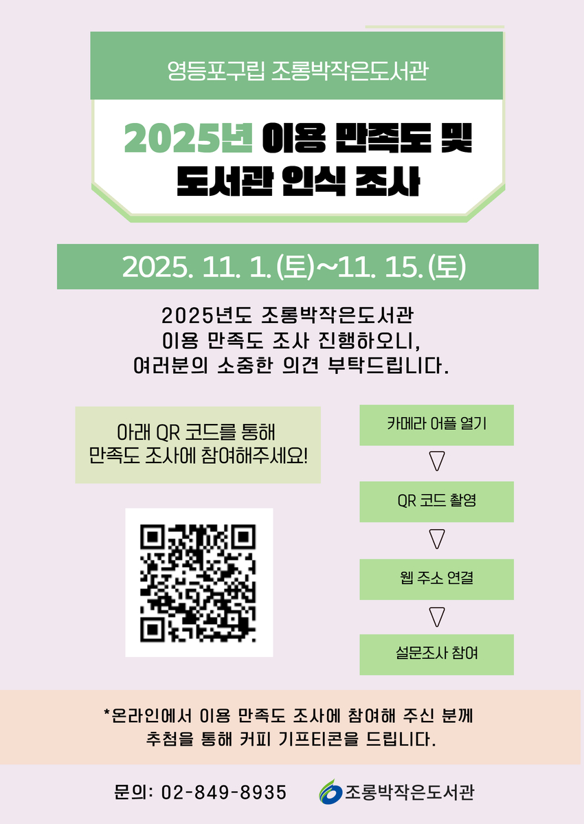 | 제목 | 2025년 조롱박작은도서관 이용자 만족도 설문 조사 안내(~11.15.) |