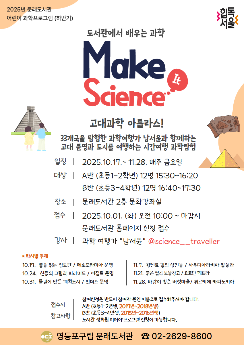 문래도서관 2025년 어린이 과학프로그램 A반 접수 페이지입니다. 1학년(2018년)~2학년(2017년 12명 / 15:30~16:20 각 반마다 연령제한이 있으며, 자녀이름(정회원)으로만 접수 가능합니다. 모든 수업에 빠짐없이 참여가 가능한 어린이만 신청하여 주시기 바랍니다. ![]() |