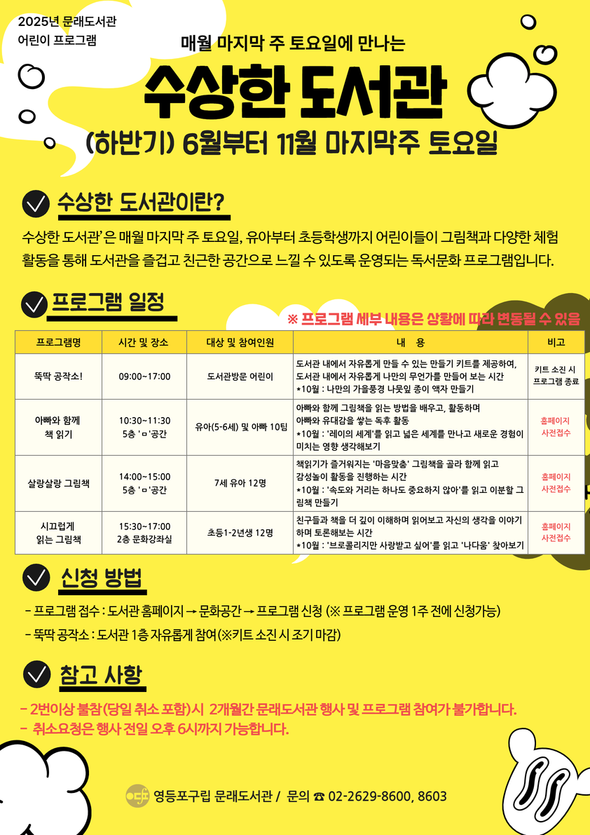 '아빠와 함께 책 읽기' 프로그램은 5층에서 진행합니다. 참석 시 참고바랍니다. ○ 운영기간 : 10.25.(토) 10:30~11:30 ○ 운영대상 : 5, 6세(2020-2021년생) 유아와 아빠 -2025년 기준이 적용됩니다. ○ 운영장소 : 문래도서관 5층 공간 마루 ‘ㅁ’ 공간 - 아이와 함께 재미있게 책읽기 ![]() |