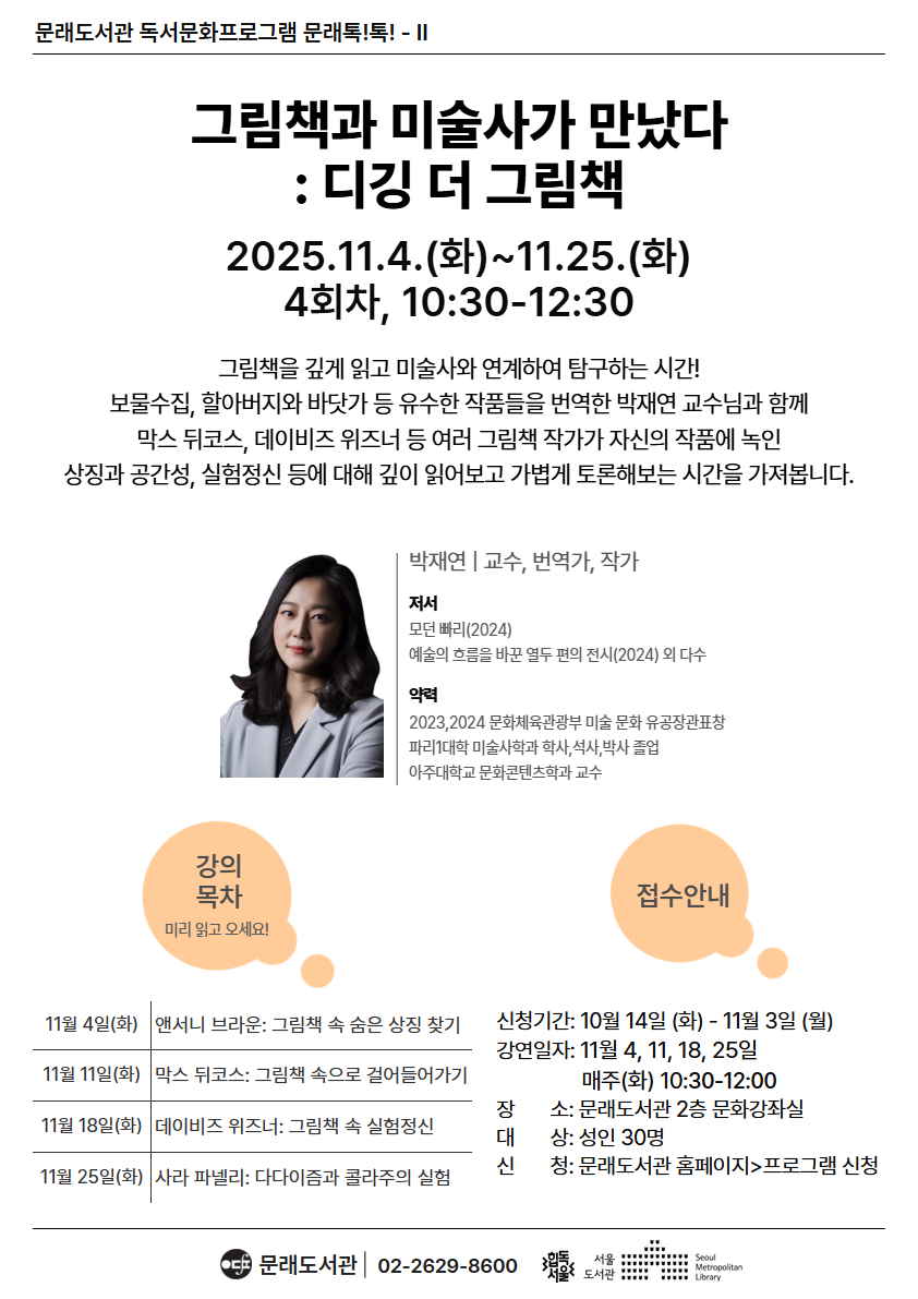 "그림책과 미술사가 만났다!" 프랑스 그림책의 유수한 작품들을 번역해오신 박재연 교수님과 함께 앤서니 브라운, 막스 뒤코스, 데이비즈 위즈너 등 여러 그림책 작가가 자신의 작품에 녹인 상징과 공간성, 실험 정신에 대해 미술사와 연계하여 감상하고 가볍게 토론해보는 시간을 가져봅니다. ![]() |