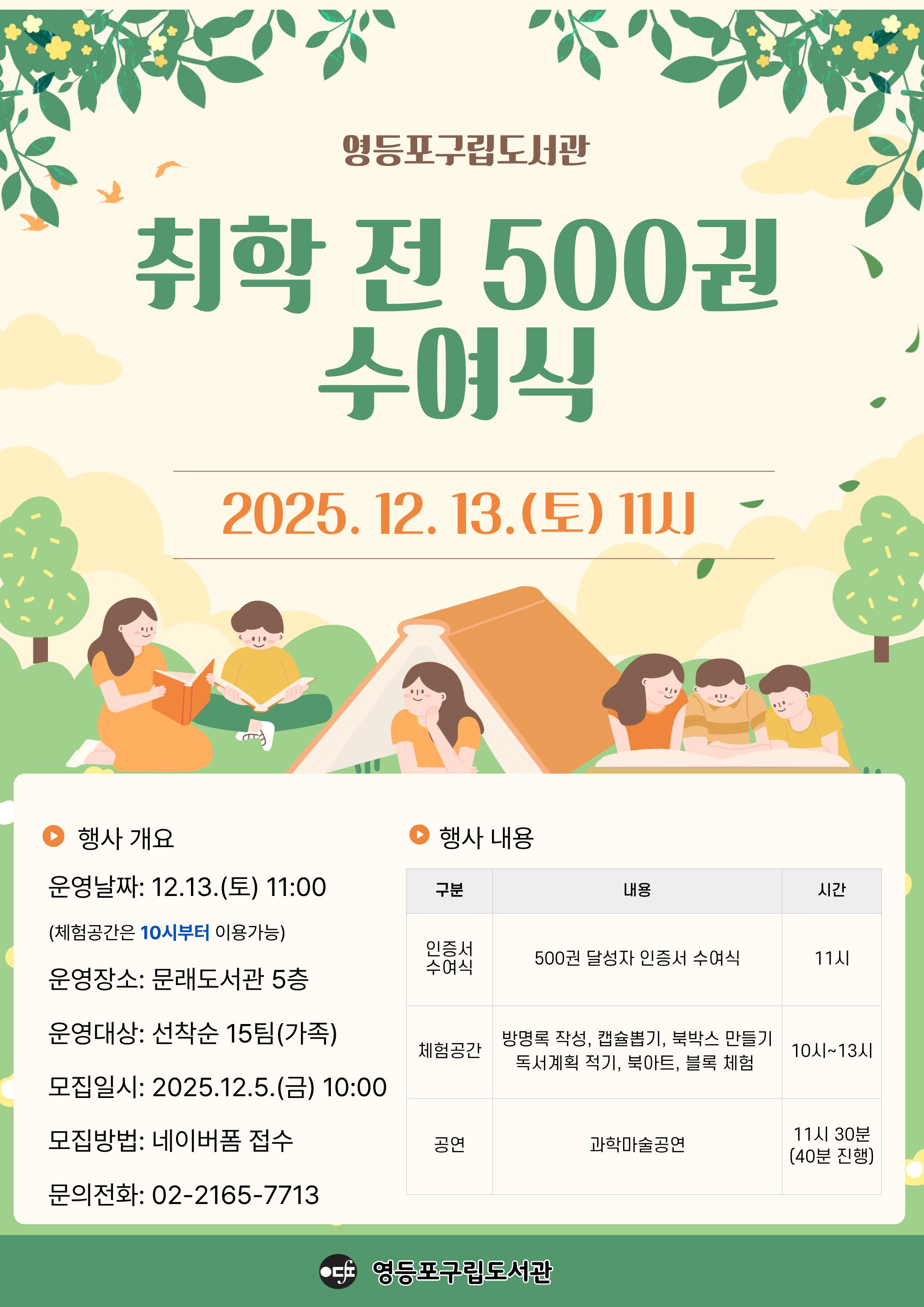 ![]() <취학 전 500권 읽기> 인증서 수여식과 과학 마술공연, 간단한 만들기를 체험할 수 있는 '500권 DAY' 행사를 진행합니다. <취학 전 500권 읽기> 참여자 누구나! 먼저 5단계를 달성한 아이들을 축하하고 재미있는 과학 마술공연도 관람하며 500권의 날을 함께 즐겨주세요:) 신청 바로가기➡️ 🔔 진행일시: 12.13.(토) 11시~13시 / 체험공간은 10시부터 이용 가능 🔔 장 소: 문래도서관 5층 공간마루 🔔 행사내용: 인증서 수여식(5단계 달성자), 과학 마술공연 관람, 간단한 만들기 체험 🔔 참가인원: 선착순 15팀(가족) / 가족 단위로 신청하는 행사로 링크 내 참여할 가족 인원 수를 꼭 기재 부탁드립니다. 🔔 모집일정: 12.5.(금) 10:00~ 마감시 까지 🔔 문의사항: 02-2165-7713(도서관운영팀, 월~금) 인증서 수여식에 참여하여 5단계를 달성한 아이들을 함께 축하하고 달성 의지를 다져보세요✨ 11월 30일 이후에 달성한 아이들은 2026년 상반기에 인증서를 받을 수 있습니다. ※ 체험 공간은 신청하지 않아도 이용 가능합니다. ※ 주말 도서관 이용객이 많아 주차장이 혼잡하며, 주차가 불가능할 수 있습니다. 대중교통 이용을 부탁드립니다. |
