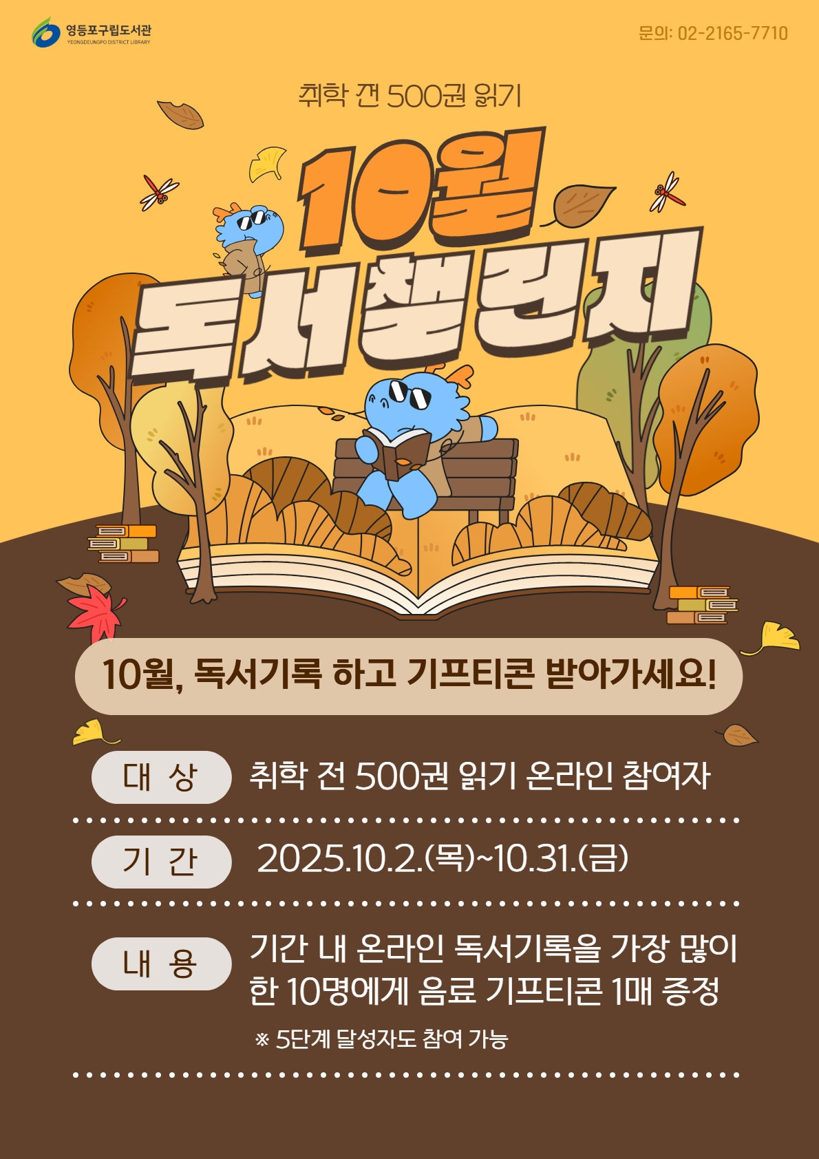 ![]() 추석 연휴에도 꾸준히 독서기록하고 기프티콘 받아가세요🍂🍂 10월 한 달간, 독서기록을 가장 많이 한 어린이 총 10명에게 카페음료 기프티콘 1매를 드립니다.🥤☕ ▶참여기간: 2025.10.2.(목)~10.31.(금) / 11.3.(월) 당첨자 기프티콘 발송 ▶참여대상: 취학 전 500권 읽기 온라인 참여자(2~5단계) / 온라인 참여자 누구나 별도 신청 없이 자동 참여, 5단계 달성자도 이어서 독서기록 가능 ▶참여방법: 10월 한 달간, 열심히 독서기록 올리기! (이벤트 기간동안 작성한 독서기록 권수만 인정) 12월 13일(토) 인증서 수여식과 공연이 함께하는 하반기 <500권 DAY>가 진행됩니다! 마무리까지 조금 더 힘내서 <500권 DAY>를 함께 빛내주세요:)✨✨ |