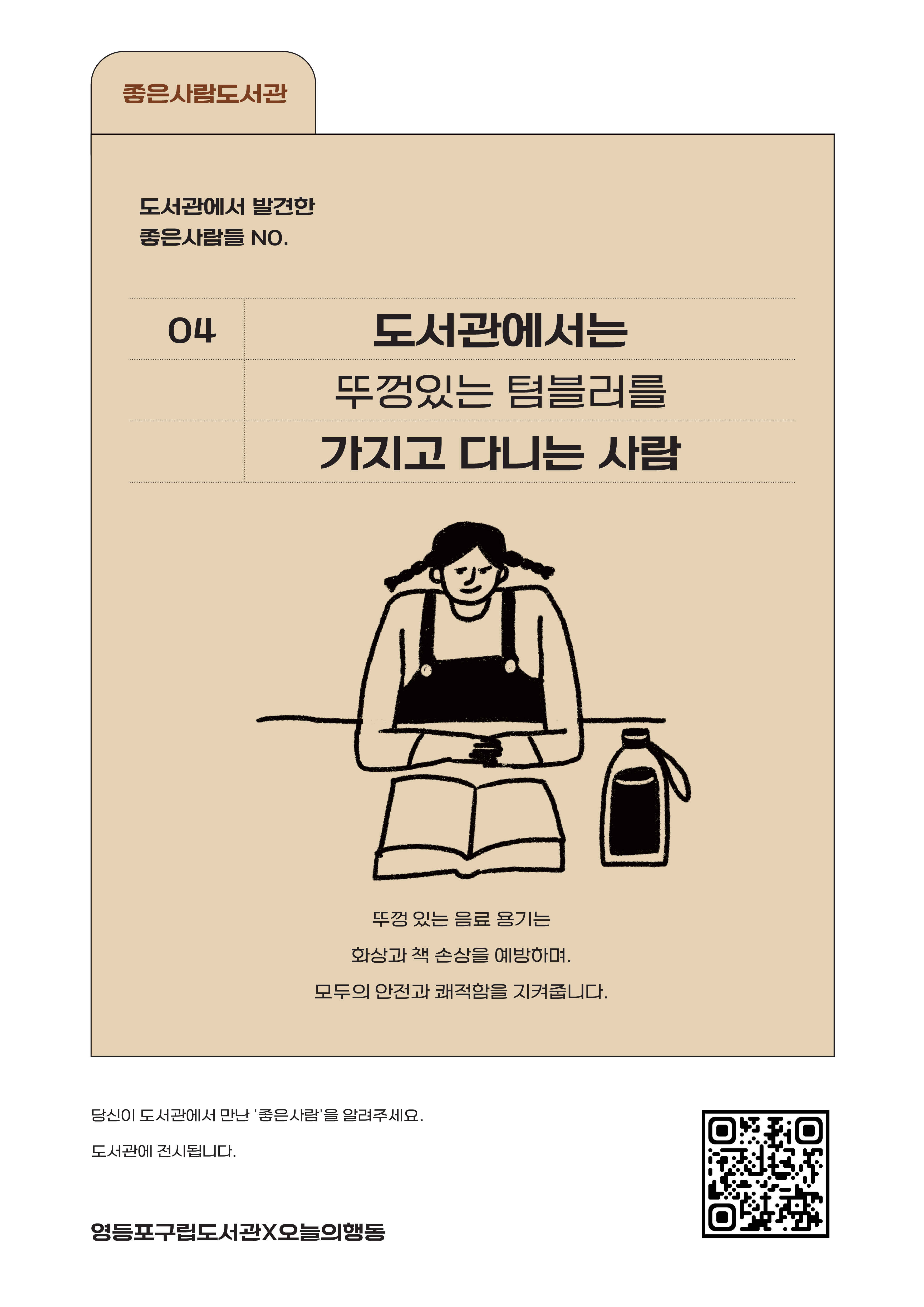 🧋신길도서관 1층에는 다양한 음료를 파는 북카페가 있어요. 아메리카노부터 아이들을 위한 어린이 음료까지, 다양한 이용자가 북카페를 이용하고 있습니다. ![]() 네번째 좋은사람도서관은 <도서관에서는 뚜껑있는 텀블러를 가지고 다니는 사람>입니다. 뚜껑 있는 음료 용기는 화상과 책 손상을 예방하며, 다양한 이용자가 오가는 도서관에서 모두의 안전과 쾌적함을 지켜줍니다. 매달 새로운 좋은사람도서관을 신길도서관 곳곳에서 발견해보세요. 혹시 도서관을 오가면서 또다른 좋은사람을 발견하셨다면 아래 링크로 제보해주세요. 여러 제보를 모아 연말에 도서관에서 전시가 진행됩니다 [좋은사람도서관 제보하기👆] 이 캠페인은 사회적협동조합 오늘의행동과 함께 합니다🤗 ▪️도서관에서 발견한 좋은 사람들 No.1 확인하기 ▪️도서관에서 발견한 좋은 사람들 No.2 확인하기 ▪️도서관에서 발견한 좋은 사람들 No.3 확인하기 |