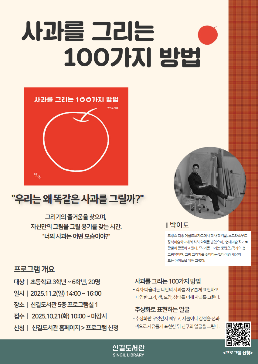 ![]() 🍎 사과를 그리는 100가지 방법 🖌️ 박이도 작가 현대미술 작가로 활발히 활동하고 있으며, 「사과를 그리는 방법 100가지 방법」은 작가의 첫 그림책이며, 그림 그리기를 좋아하는 딸과 세상의 모든 아이들을 위해 나온 책입니다. 작가님과 함께「사과를 그리는 방법 100가지 방법」을 보면서 남들의 시선에 벗어나, 나만의 자유로운 사과 그림을 그리는 시간을 가져봅니다. 그리고 추상화를 간단히 배워보고 옆 친구들의 얼굴을 관찰하고 자유롭게 그려보는 그리기의 즐거움을 경험하는 시간을 가집니다. ▪️ 프로그램 일시: 11월 2일 일요일 14:00~16:00 ▪️ 장소: 신길도서관 5층 프로그램실 1 ▪️ 대상: 초등학교 3학년~6학년, 20명 ▪️ 모집일시: 10월 21일(화) 오전 10시부터 ~마감시 ▪️ 신청방법: 신길도서관 홈페이지 로그인 후 프로그램 신청 (정회원만 신청 가능) ✔️ 프로그램 중 촬영된 사진은 비영리 목적의 도서관 홍보에 사용될 수 있으며, 프로그램 신청 시 이에 동의한 것으로 간주됩니다. 📞문의: 02-2165-7700  |