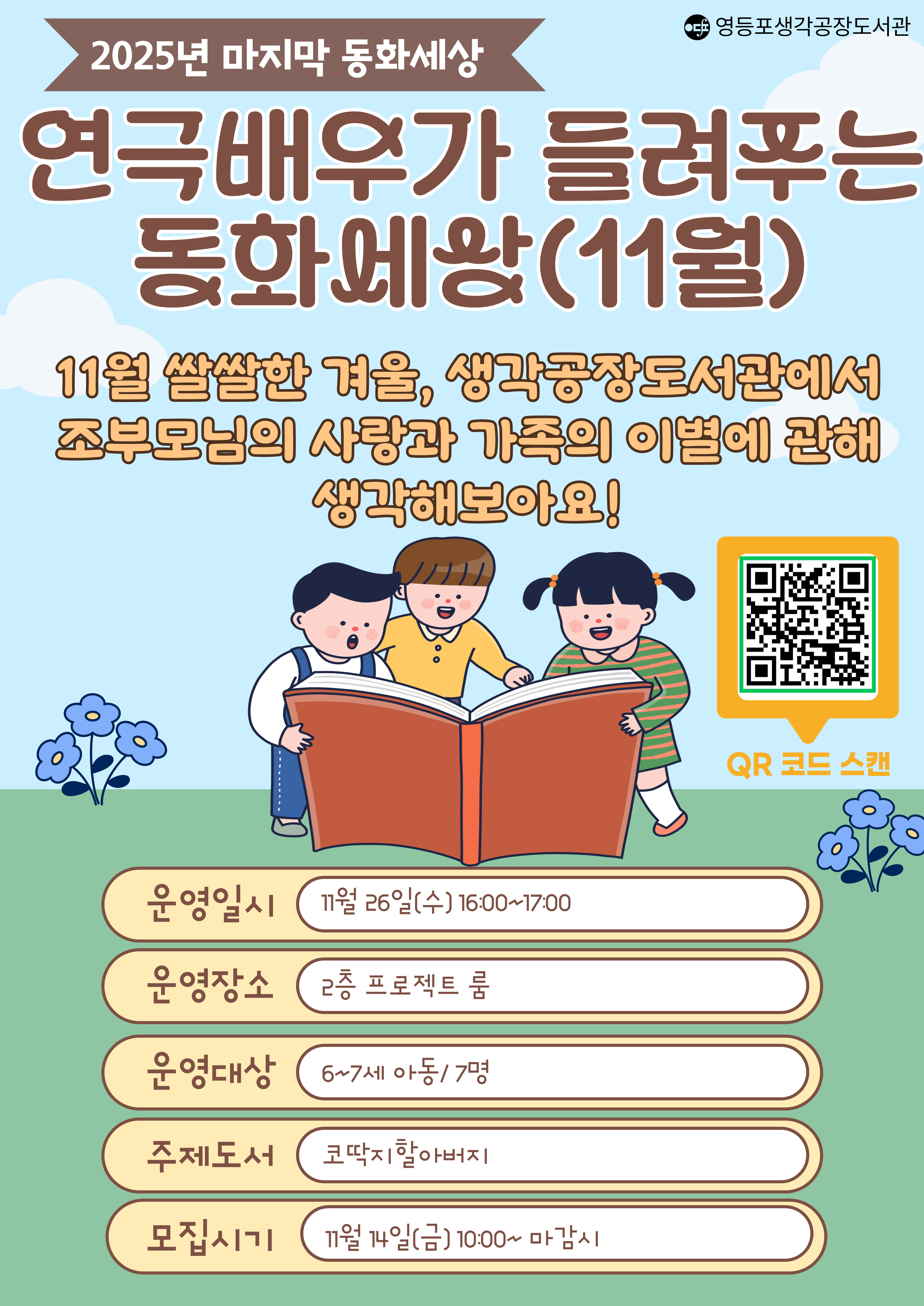 ![]() 🏠운영일시: 2025년 11월 26일(수) [16:00~17:00] 🏠접수기간: 2025년 11월 14일(금) 10시~모집시 마감 🏠운영대상: 6~7세 아동, 7명 🏠운영장소: 영등포생각공장도서관 2층 프로젝트룸 🏠주제도서:「코딱지 할아버지 / 신순」 🏠운영강사: 구재숙 연극 배우 📞문의: 02-2069-1893(1층 통합데스크) 바로가기 링크: https://m.site.naver.com/1VyiB |