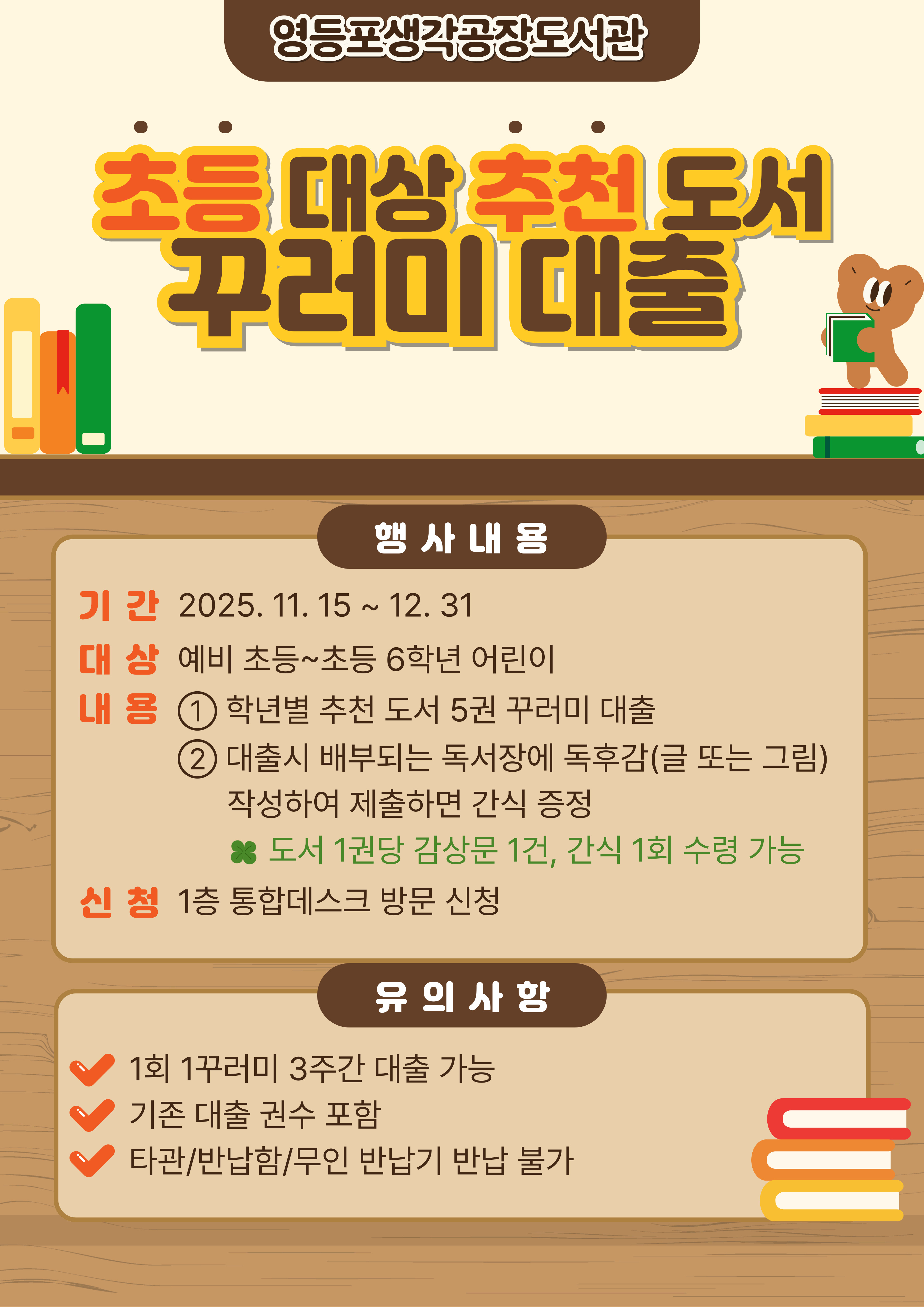 ![]() ![]() ![]() ![]() ![]() 📚초등 대상 추천 도서 꾸러미 대출🏫 예비 초등생부터 초등 6학년을 위한 추천 도서를 꾸러미로 대출해 드립니다. 대출시 배부되는 독서장에 독후감을 그림이나 글로 작성하여 제출하면 간식을 드려요. ♥️ 기간: 2025. 11. 15~12.31 ♥️ 대상: 예비 초등~초등 6학년 어린이 ♥️ 내용: (1) 학년별 추천도서 5권 꾸러미 대출 (2) 대출시 배부되는 독서장에 독후감 (글 또는 그림) 작성하여 제출하면 간식 증정 * 도서 1권당 감상문 1건, 간식 1회 수령 가능 ♥️ 신청: 1층 통합데스크 방문 신청 ✔️ 1회 1꾸러미 3주간 대출 가능 ✔️ 기존 대출권수 미포함 ✔️ 타관/반납함/무인 반납기 반납 불가 |