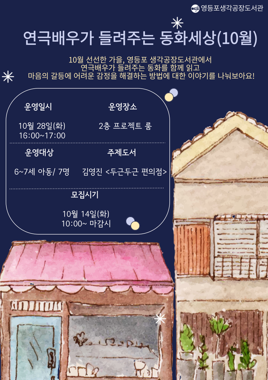 ![]() 📌연령 제한이 있는 프로그램으로 2019년생~2020년생 자녀분의 계정으로 로그인하여 직접 신청해주셔야 합니다. (25년 기준) 📌회원증을 발급받은 정회원만 신청 가능합니다. (준회원: 영등포구립도서관 회원증 미발급자로 홈페이지 회원가입만 되어있는 상태) 📌SMS 수신 동의 여부와 무관하게 안내 문자 및 담당자 연락을 받으실 수 있습니다. 📌접수 기간내에 사전 취소 없이 불참하시거나, 운영기간중에 나가시는 경우에는 다음 프로그램 참여시 반려됩니다. (사전 연락 진행 O) 📌프로그램 운영 중 촬영된 사진은 비영리 목적의 도서관 홍보에 사용될 수 있으며, 프로그램 신청 시 이에 동의한 것으로 간주됩니다. 📌영등포생각공장도서관은 정원이 적습니다. 강사님과 대기자들을 배려하여 꼭! 참석 가능한 아이들만 신청해주시길 바랍니다. 2025년 2월부터 11월까지 문화가 있는 날마다 찾아오는 동화 세상! 10월에 들려줄 이야기는 <두근두득 편의점> / 김영진입니다💚 책을 읽으며 다양한 의성어와 의태어로 놀아보아요! 🏠운영일시: 2025년 10월 28일(화) [16:00~17:00] 🏠접수기간: 2025년 9월 11일(목) 10시~모집시 마감 🏠운영대상: 6~7세 아동, 7명 🏠운영장소: 영등포생각공장도서관 2층 프로젝트룸 🏠주제도서:「두근두근 편의점 / 김영진」 🏠운영강사: 권영 연극 배우 📞문의: 02-2069-1893(1층 통합데스크) |
