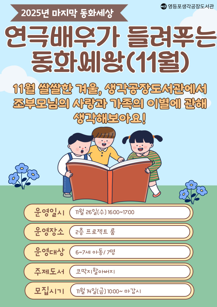 📌연령 제한이 있는 프로그램으로 2019년생~2020년생 자녀분의 계정으로 로그인하여 직접 신청해주셔야 합니다. (25년 기준)📌회원증을 발급받은 정회원만 신청 가능합니다. (준회원: 영등포구립도서관 회원증 미발급자로 홈페이지 회원가입만 되어있는 상태) 📌SMS 수신 동의 여부와 무관하게 안내 문자 및 담당자 연락을 받으실 수 있습니다. 📌접수 기간내에 사전 취소 없이 불참하시거나, 운영기간중에 나가시는 경우에는 다음 프로그램 참여시 반려됩니다. (사전 연락 진행 O) 📌프로그램 운영 중 촬영된 사진은 비영리 목적의 도서관 홍보에 사용될 수 있으며, 프로그램 신청 시 이에 동의한 것으로 간주됩니다. 📌영등포생각공장도서관은 정원이 적습니다. 강사님과 대기자들을 배려하여 꼭! 참석 가능한 아이들만 신청해주시길 바랍니다. 2025년 2월부터 11월까지 문화가 있는 날마다 찾아오는 동화 세상! 11월에 들려줄 이야기는 <코딱지 할아버지> / 신순재입니다💚 책을 읽으며 다양한 의성어와 의태어로 놀아보아요! 🏠운영일시: 2025년 11월 26일(수) [16:00~17:00] 🏠접수기간: 2025년 11월 14일(금) 10시~모집시 마감 🏠운영대상: 6~7세 아동, 7명 🏠운영장소: 영등포생각공장도서관 2층 프로젝트룸 🏠주제도서:「코딱지 할아버지 / 신순」 🏠운영강사: 구재숙 연극 배우 📞문의: 02-2069-1893(1층 통합데스크) |