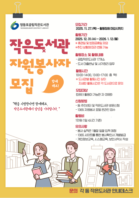 영등포공립작은도서관 자원봉사자 모집(17개소)