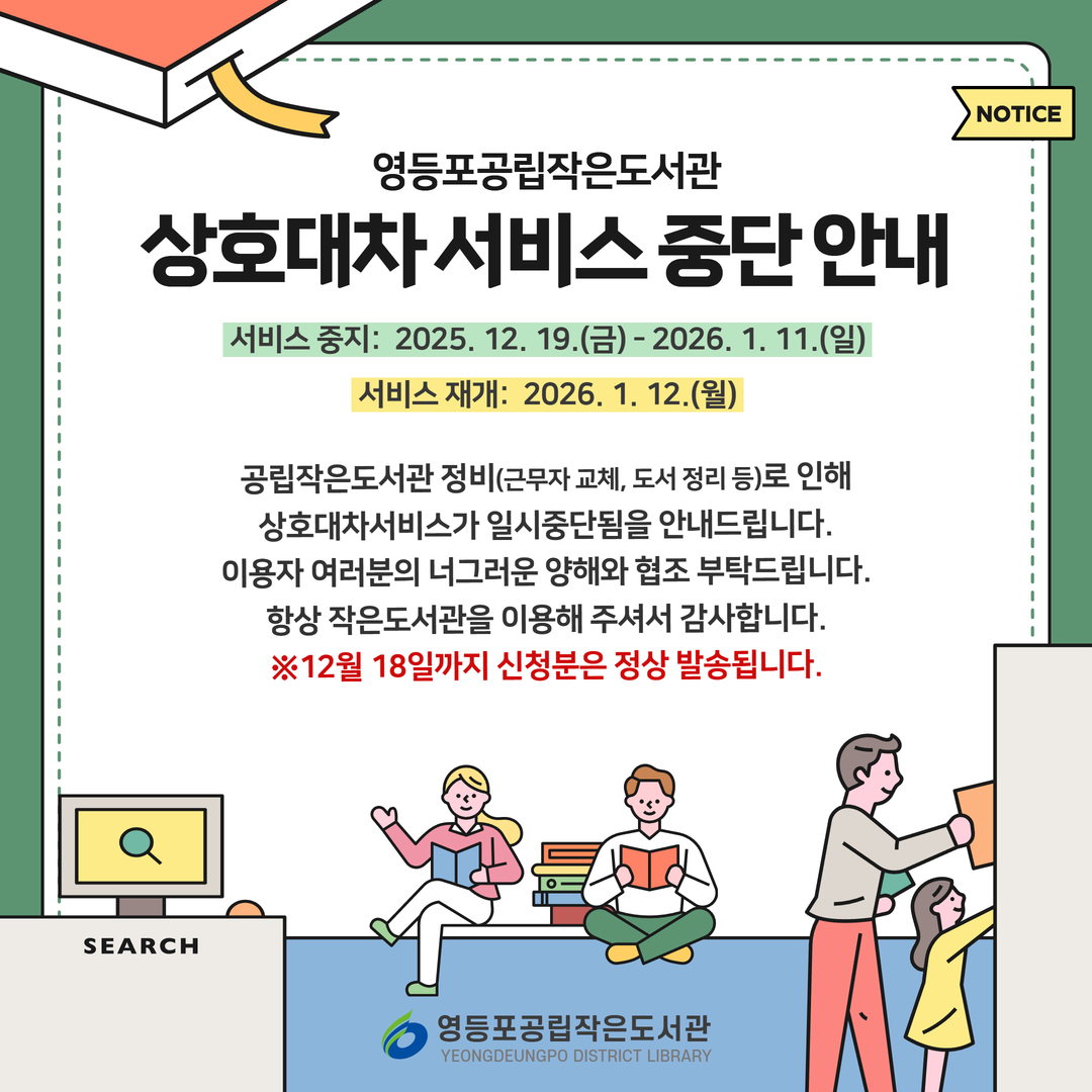 (25.12.19.~26.1.11.) 공립작은도서관 상호대차 신청·제공 일시중지 안내