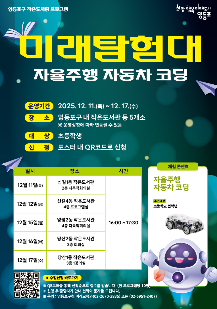 ○ 장 소: 영등포구 내 작은도서관 등 5개소(포스터 참조) ○ 대 상: 초등학생 ○ 신 청: 포스터 내 QR코드로 신청(선착순 접수 프로그램당 10명) ![]() |