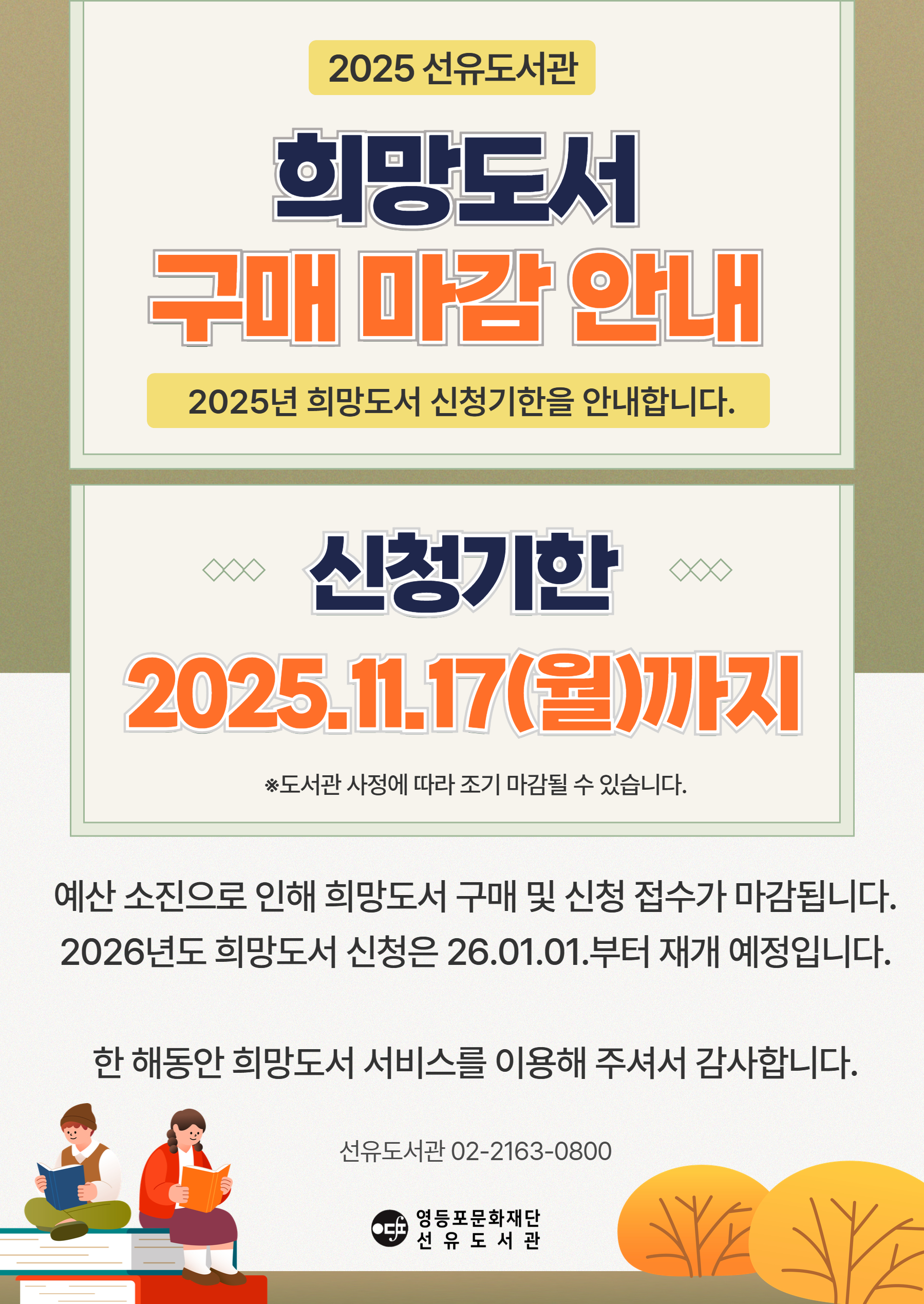 | 제목 | 선유도서관 2025년도 희망도서 구매 마감 안내 |