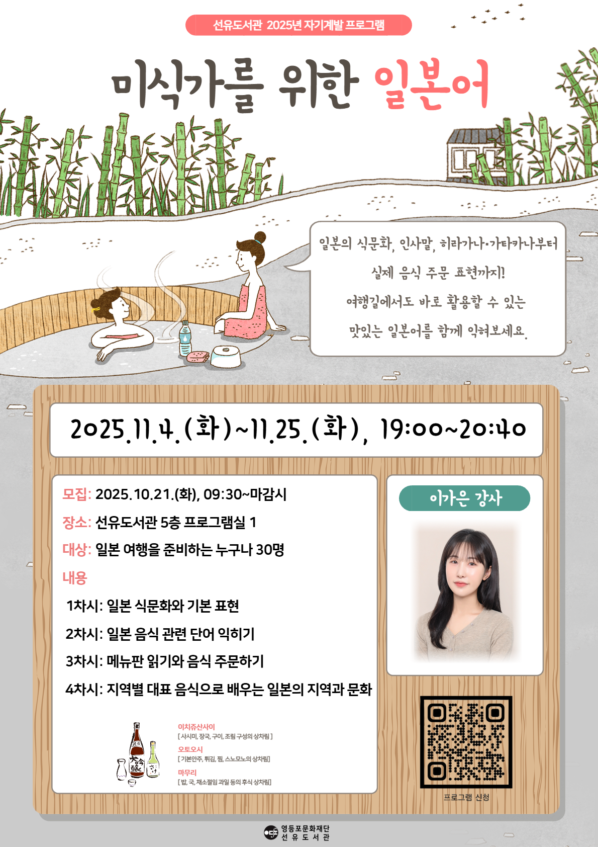 안녕하세요, 선유도서관입니다, 선유도서관에서는 음식이라는 친근한 주제를 통해 일본어와 일본 문화를 배우는 특별한 강좌 《미식가를 위한 일본어》를 운영합니다. 일본의 다양한 음식 문화와 함께 기초 회화, 생활 표현을 익히며 여행과 일상에서 활용할 수 있는 실용 일본어를 배워보세요. 일본어가 낯선 분도 부담 없이 참여하실 수 있습니다. 🎈모집 안내 ▶모집기간: 2025.10.21.(화) 09:30 ~ 마감 시 ▶모집대상: 일본 여행을 준비하는 누구나 ▶모집방법: 선유도서관 홈페이지 > 프로그램 신청 🎈강좌 일정 ▶운영기간: 2025.11.4.(화) ~ 11.25.(화), 매주 화요일 저녁 19:00~20:40 (총 4회) ▶장소: 선유도서관 5층 프로그램실1 ▶강사: 이가은 강사 ![]() |