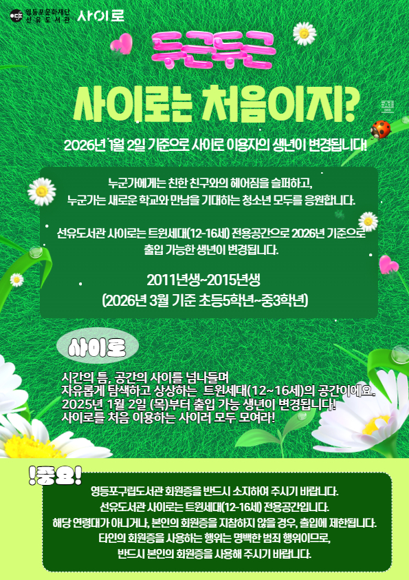 👉 2026년 1월 2일 기준, 사이로 출입 가능 연령이 변경됩니다. 2011년생부터 2015년생까지 이용 가능하니, 📚 도서관 회원증을 꼭 지참하고 사이로로 방문해 주세요 😊