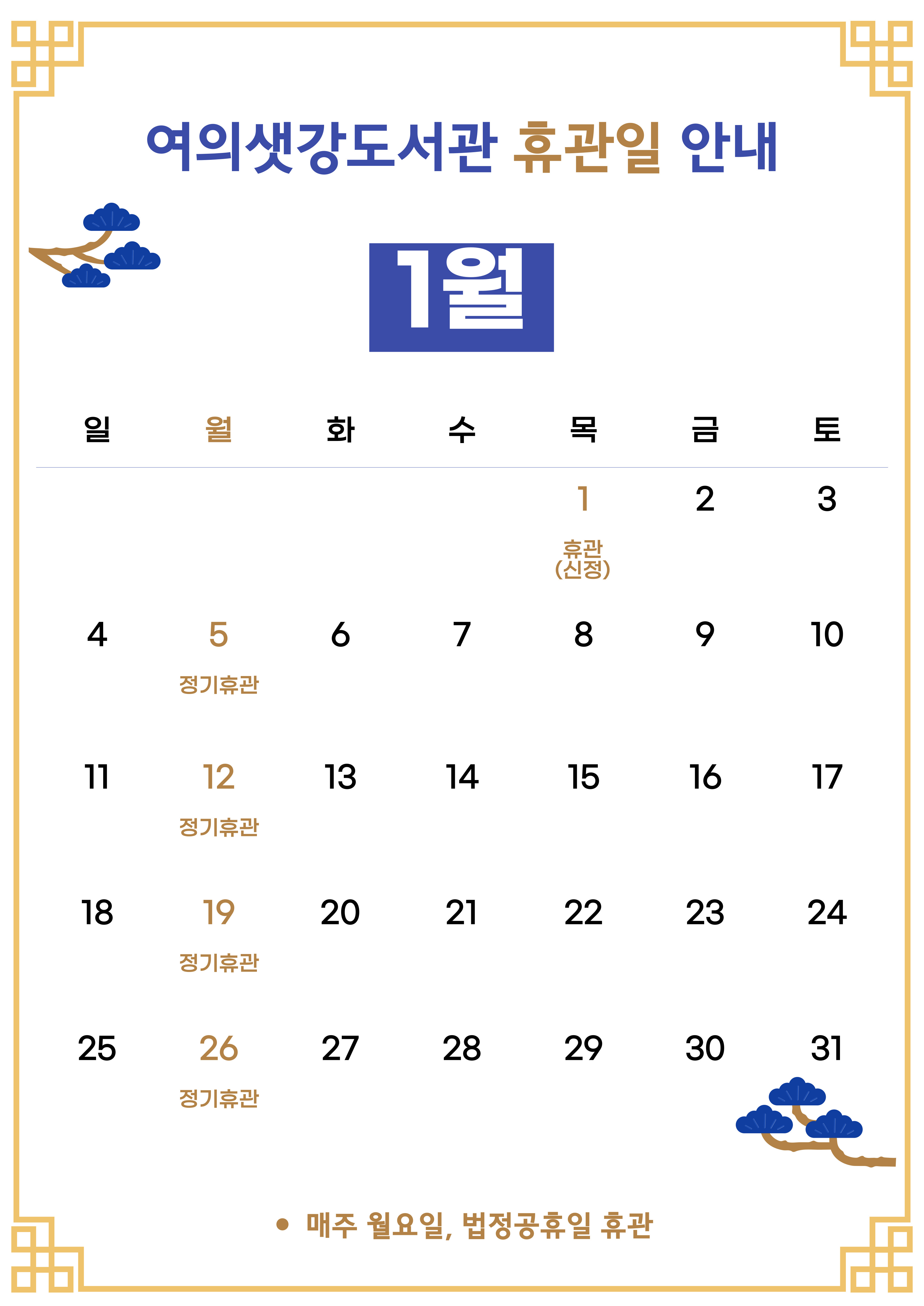 * 휴관일 : 1.1 / 1.5 / 1.12 / 1.19 / 1.26