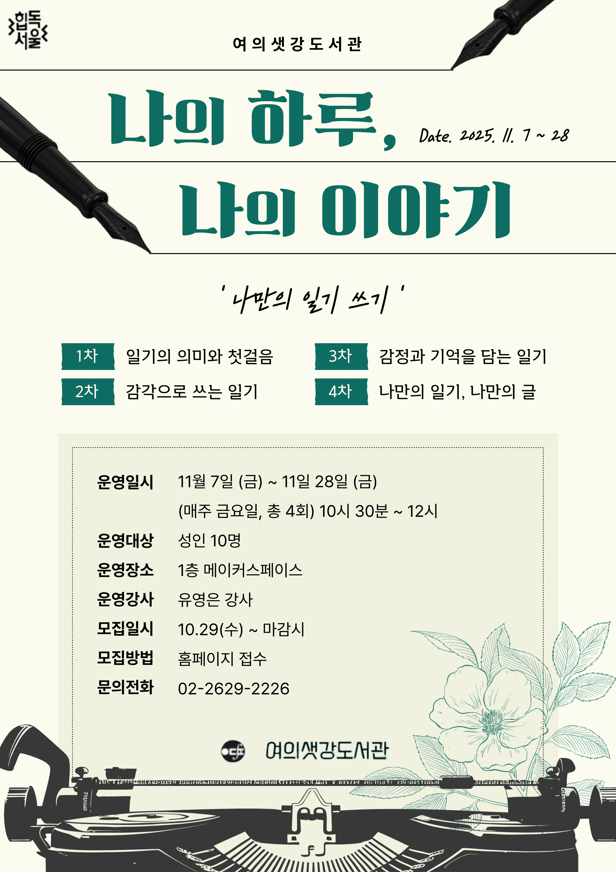 ![]() <나의 하루, 나의 이야기> - 일시 : 2025.11.7~11.28(매주금, 총4회), 10:30~12:00 - 대상: 성인, 10명 - 강사: 유영은 강사 - 장소: 여의샛강도서관 1층 메이커스페이스 - 접수: 2025.10.29(수) ~ 마감시 - 방법: 홈페이지 접수 - 문의: 02-2629-2226 ** 유의사항 - 영등포구립도서관 정회원만 신청 가능합니다. |