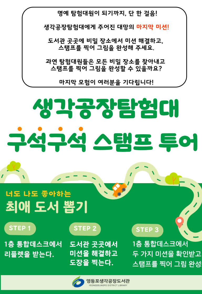 드디어 2025년 생각공장탐험대의 마지막을 장식할 '라스트 미션'이 시작된다. '명예 탐험대원'을 선발하는 최종 미션인 만큼, 지금까지와는 차원이 다른 엄청난 난이도의 미션들이 기다리고 있다. 도서관 곳곳에 숨겨진 미션들을 해결하고 스탬프를 찍어. 오직 모든 미션을 완수하고 스탬프를 찍은 탐험대원만이 **[그림]**을 완성할 수 있다. 탐험대원들은 과연 이 어려운 미션을 모두 해결하고 명예 탐험대원의 자리에 오를 수 있을까? [라스트 미션 안내]