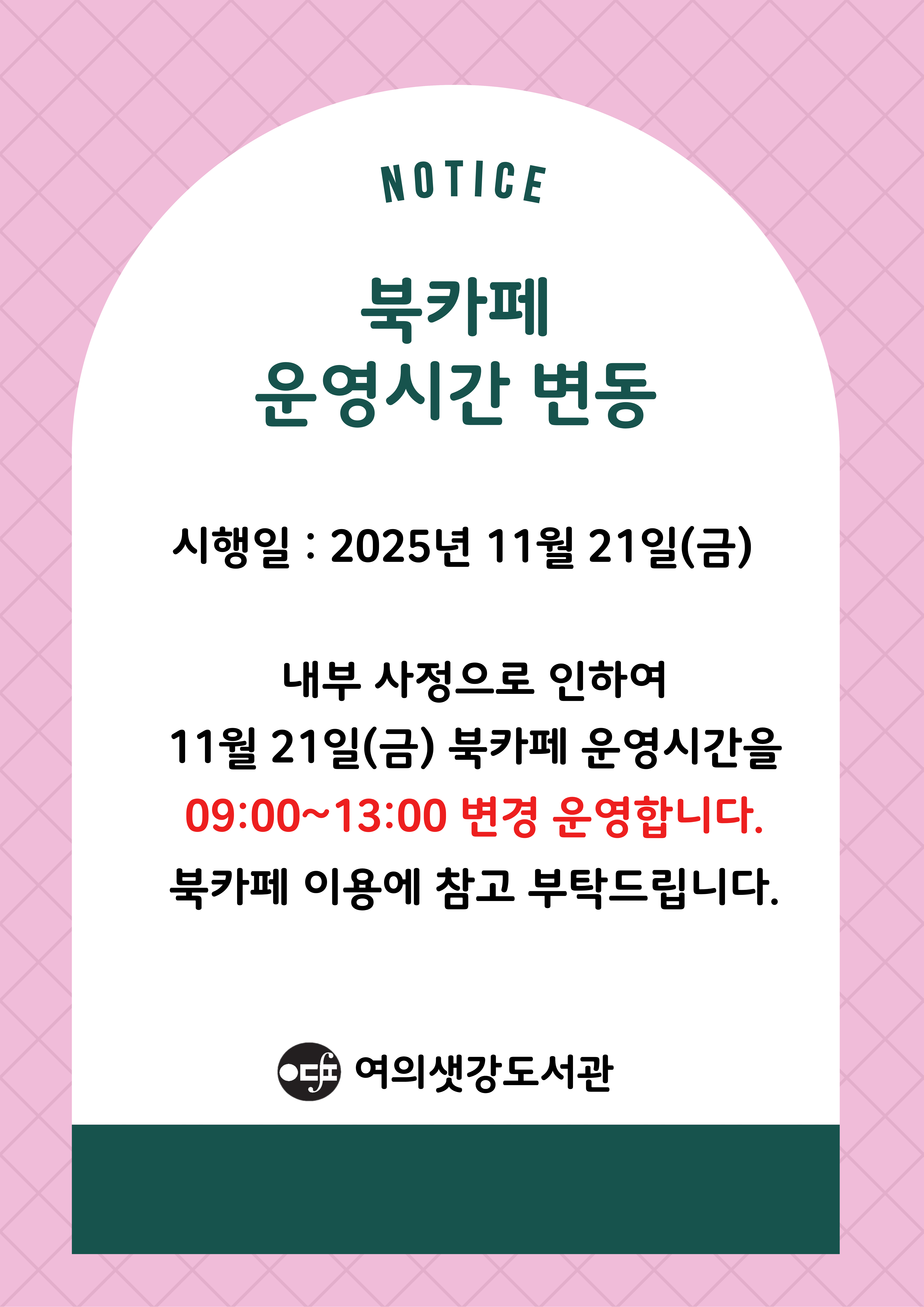 내부 사정으로 인하여 11월 21일(금) 북카페 운영시간을 09:00~13:00 변경 운영합니다.