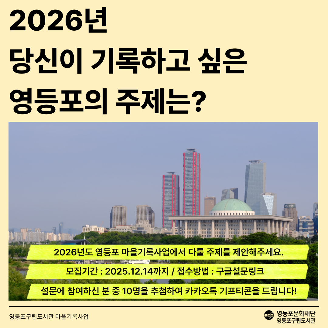 | 제목 | [기록] 2026년 당신이 기록하고 싶은 영등포의 주제는? (설문조사) |
