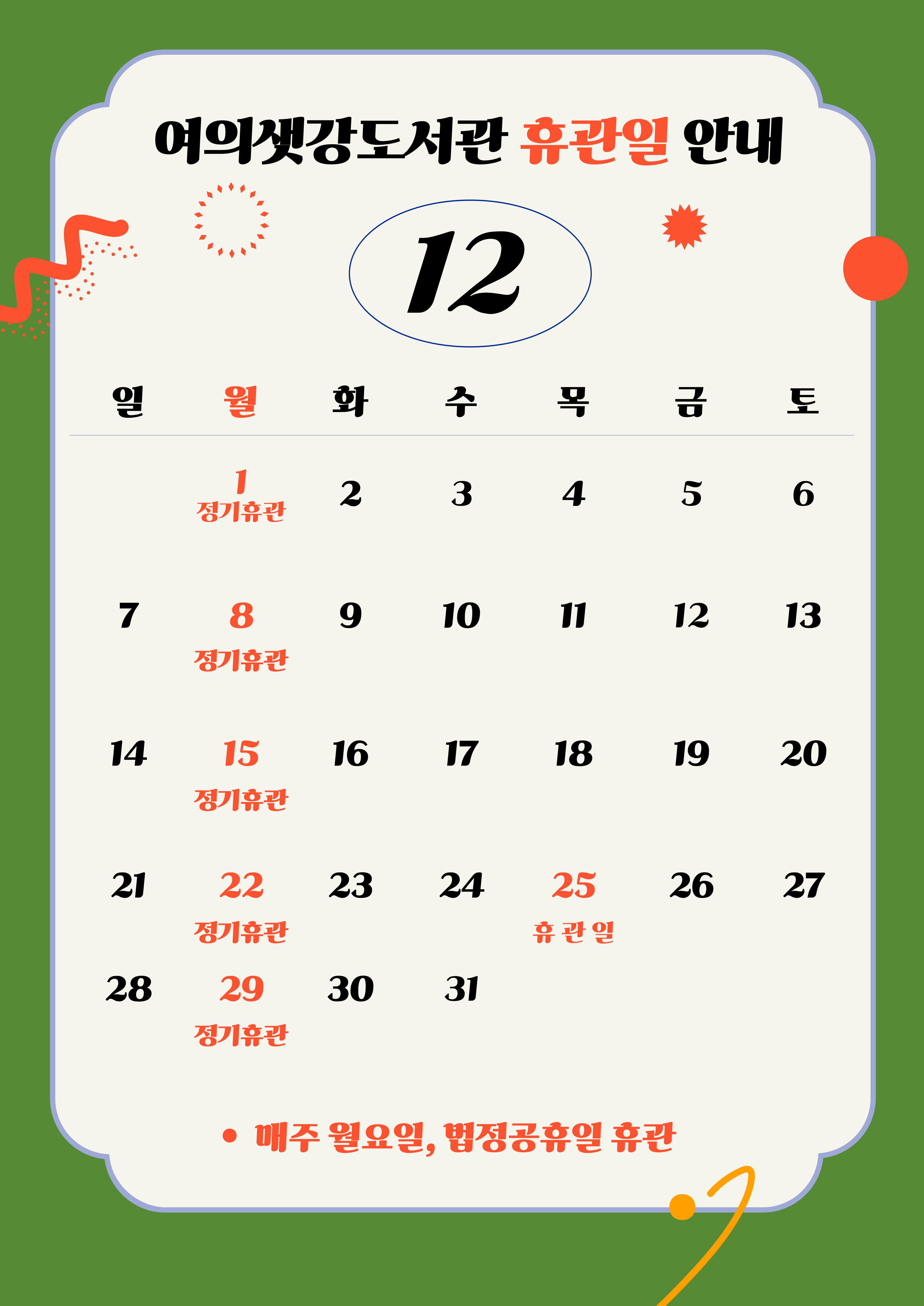* 휴관일 : 12.1/ 12.8/ 12.15 / 12.22/12.25/12.29