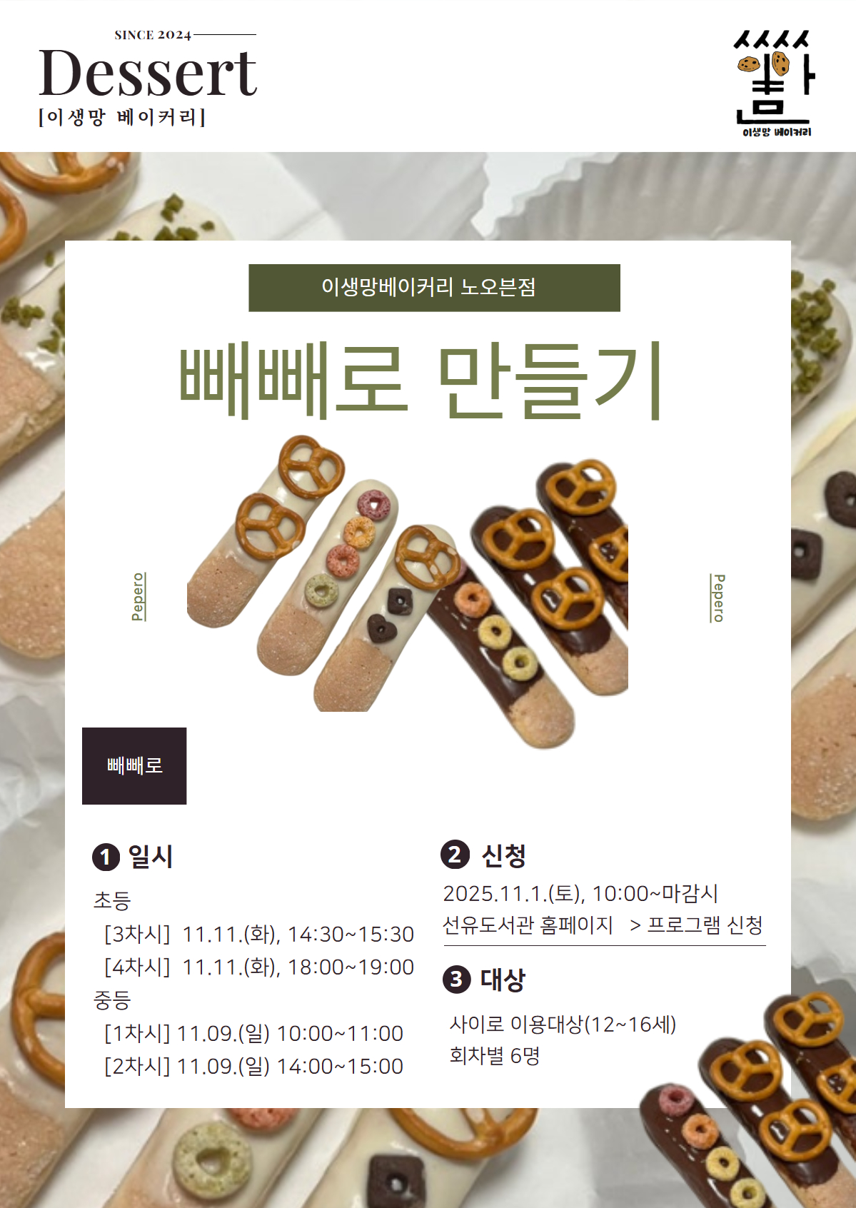 [선유도서관 사이로] 이생망베이커리 11월은 노오븐점!! 레이디핑거로 만드는 빼빼로! 11.9 (중등) 10시 / 14시 11.11 (초등 5,6) 14시 30분 / 18시 4타임으로 진행되며, 각 타임별 프로그램이 동일함으로 중복신청 시 취소될 수 있습니다 오븐을 사용하지 않는 관계로 6명씩 진행하니 많은 관심과 참여바랍니다🙌