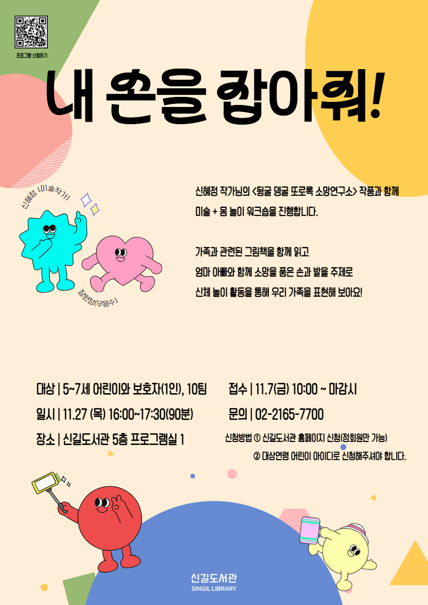 신혜정 작가님의 <뒹굴 뎅굴 또로록 소망연구소> 작품과 함께 미술+몸놀이 워크숍을 진행합니다 가족과 관련된 그림책을읽고 엄마 아빠와 함께 소망을 품은 손과 발을 주제로 신체놀이 활동을 통해 우리 가족을 표현해 보아요! ▪️강연 일시: 11.27(목요일) 16:00~17:30 ▪️ 장소: 신길도서관 5층 프로그램실 1 ▪️ 대상: 5~7세(2019~2021년생) 어린이와 보호자(1인), 10팀 ▪️ 모집일시: 11월 7일(금) 오전 10시부터 ~마감시 ▪️ 신청방법: 신길도서관 홈페이지 로그인 후 프로그램 신청 (정회원만 신청 가능) ✔️ 프로그램 중 촬영된 사진은 비영리 목적의 도서관 홍보에 사용될 수 있으며, 프로그램 신청 시 이에 동의한 것으로 간주됩니다. 📞문의: 02-2165-7700 |